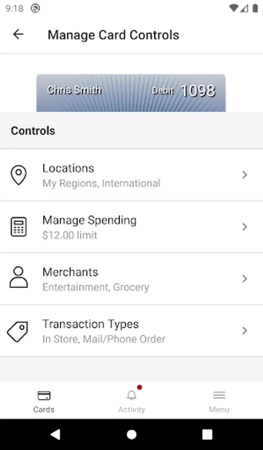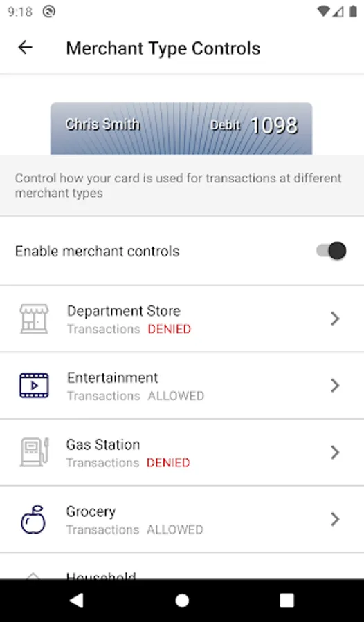 Spending limits can be established to allow transactions up to a certain dollar value and decline transactions when amounts exceed your defined thresholds. Transactions can be monitored and managed for specific merchant categories such as gas stations, department stores, restaurants entertainment, travel, and groceries. And your transactions can also be monitored for specific transaction types: in-store purchases, e-commerce transactions, mail/phone orders and ATM transactions.