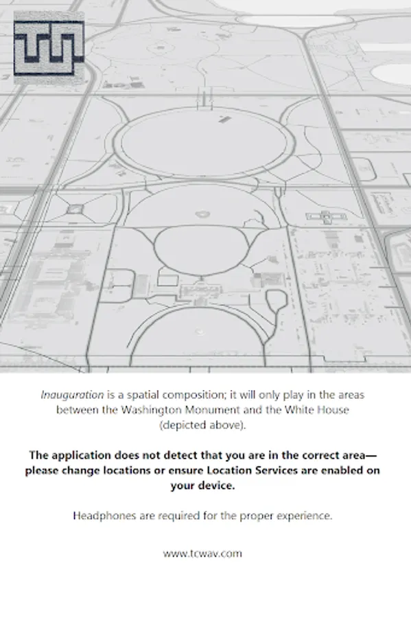 Inauguration is a composition written for the landscape between the Washington Monument and the White House in Washington, DC. This app uses your phone's GPS and compass capabilities. You will only hear sound if you are standing in the correct geographic location.