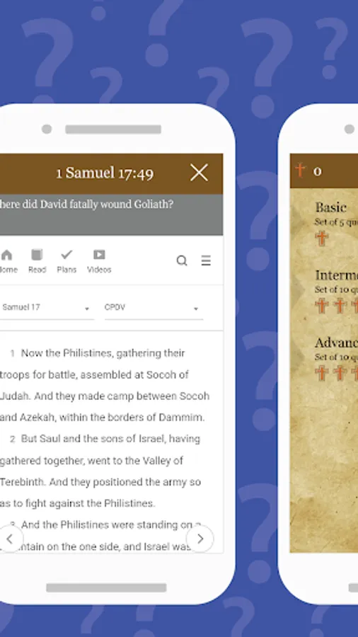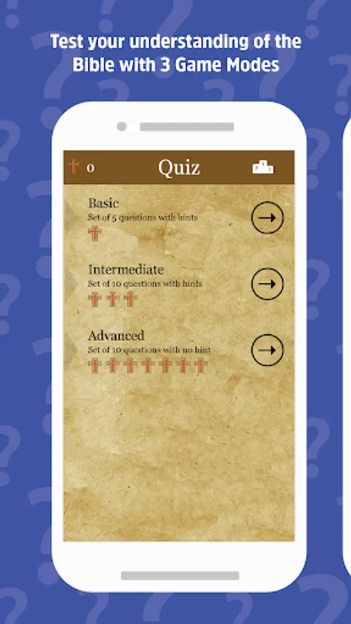 - Test your knowledge on the Bible in the challenge mode. Basic challenge has a set of 3 questions while advanced challenge has a set of 5 questions.