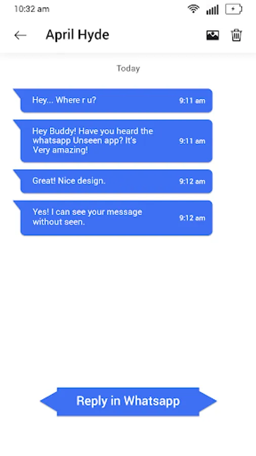 correct, your friend or family send you messages using whatsapp messenger, you have already installed our app called "Unseen - No Last Seen or Read". You will receive same messages of whatapp in our app too. you will read whatapp message from our app and your whatsapp status will No Last Seen or Unseen. No blue Tick, In short sender (your friend or family) will not know you have already read message because your status is not updated in whatapp. Even you can access photos, video, audio ,documents of whatsapp messenger. That is why we call it Hidden Whatsapp chat too.