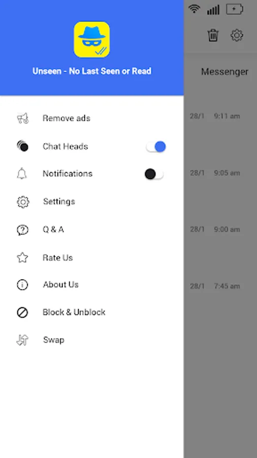 One more function of our app is blocked user within Unseen - No Last Seen or Read app. For example, you want to read your girl or boy friend messages in normal mode. You can block her/him with our app you will not see those messages in our app.