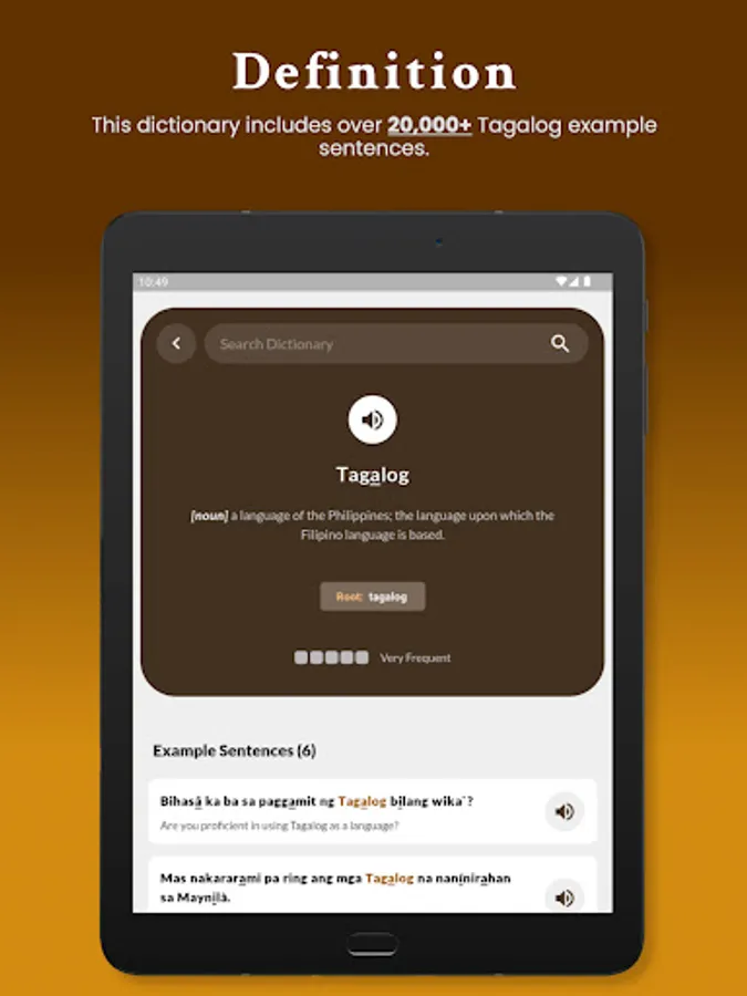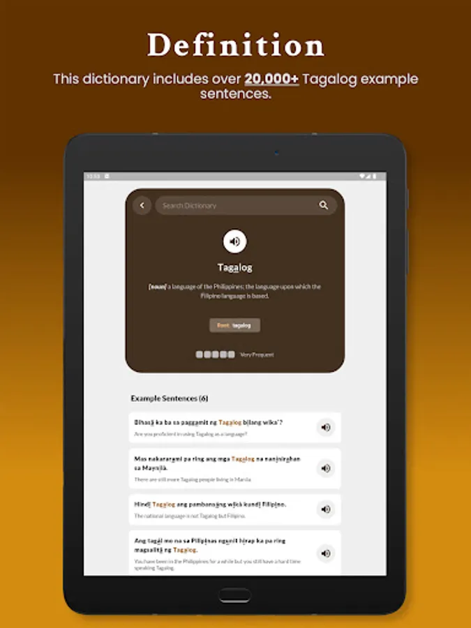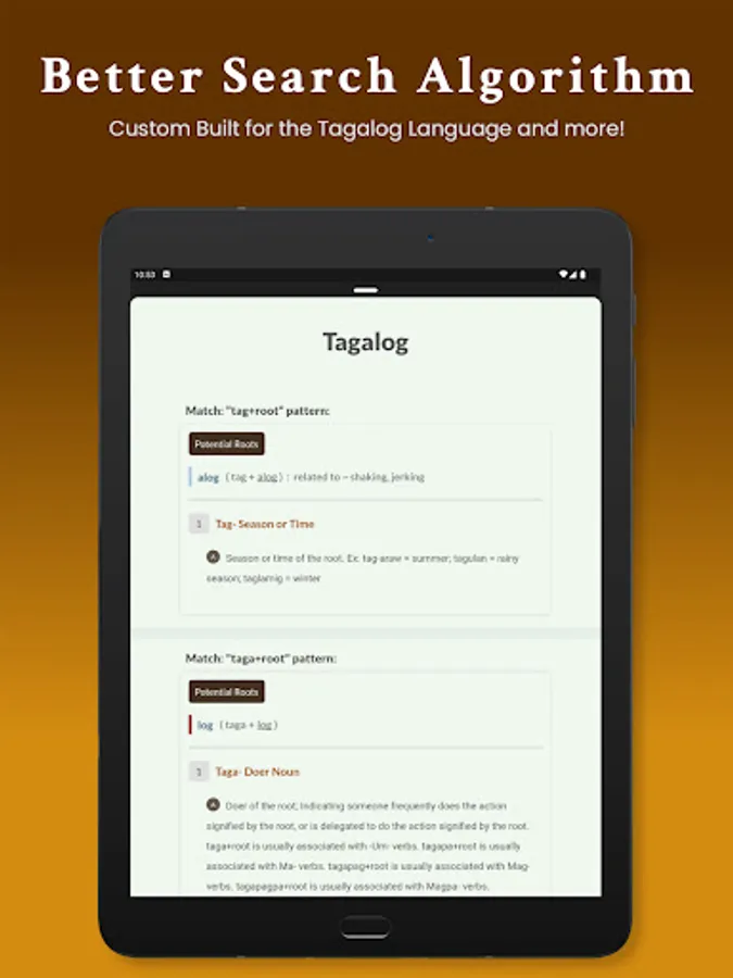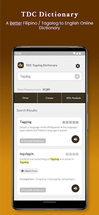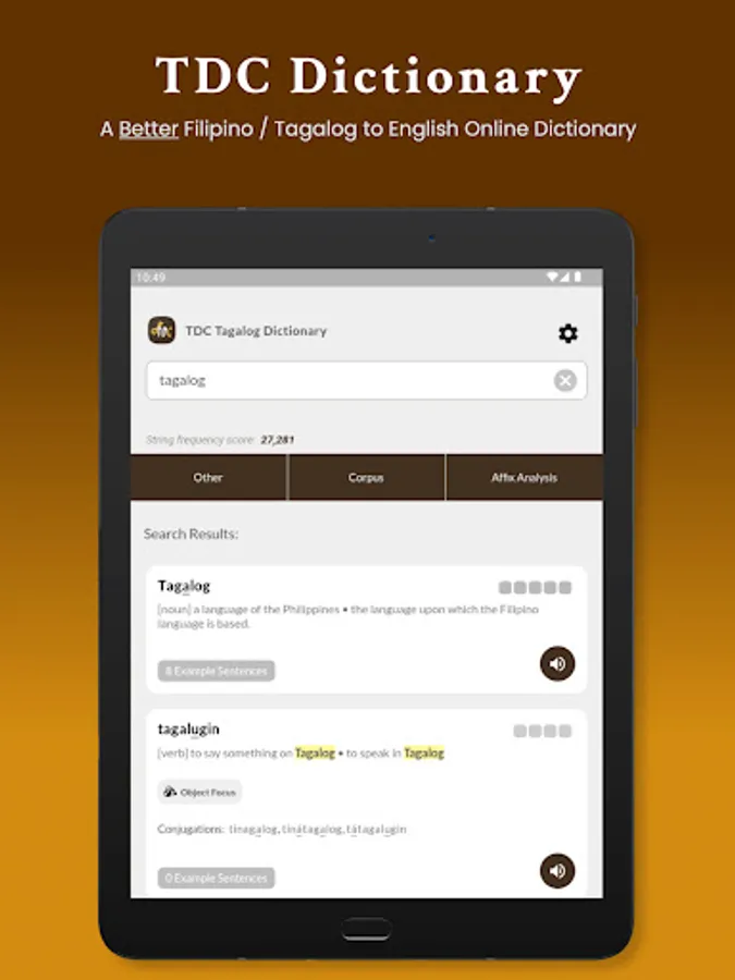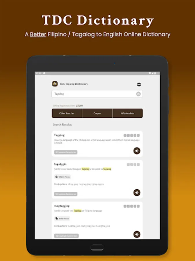 For Intermediate and Advanced learners, this app includes advanced features such as: word frequency indicators, an affix analysis program to suggest which affixes may be in use with any word you encounter, and a large searchable corpus of Tagalog texts showing real-world word use.
