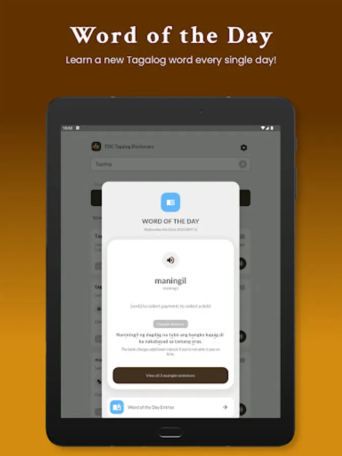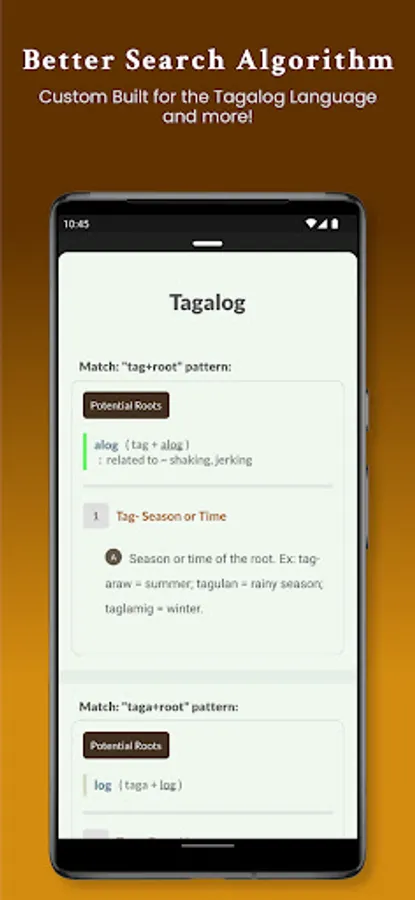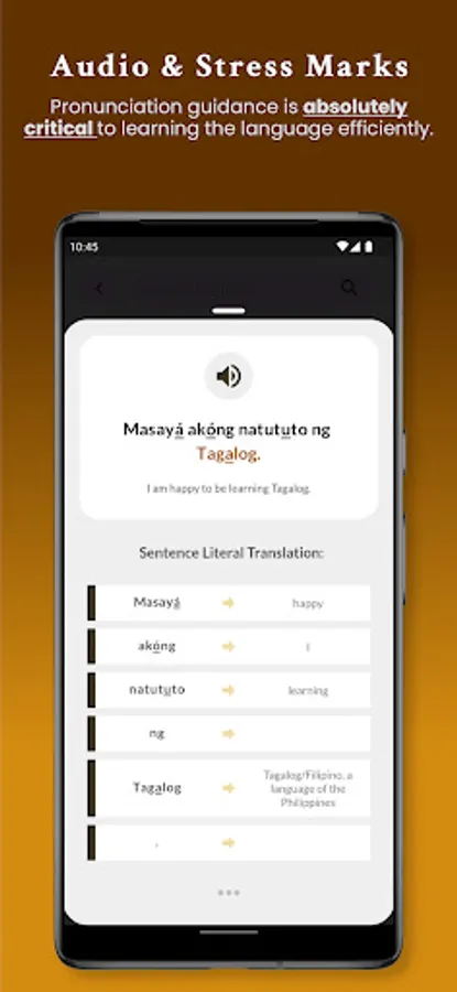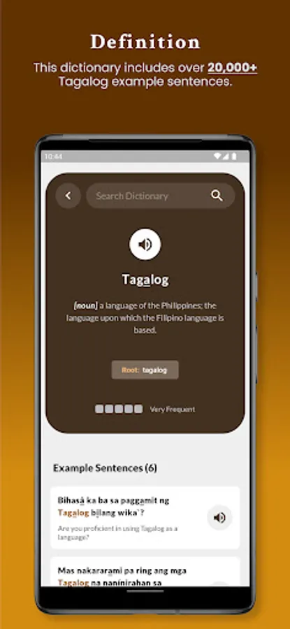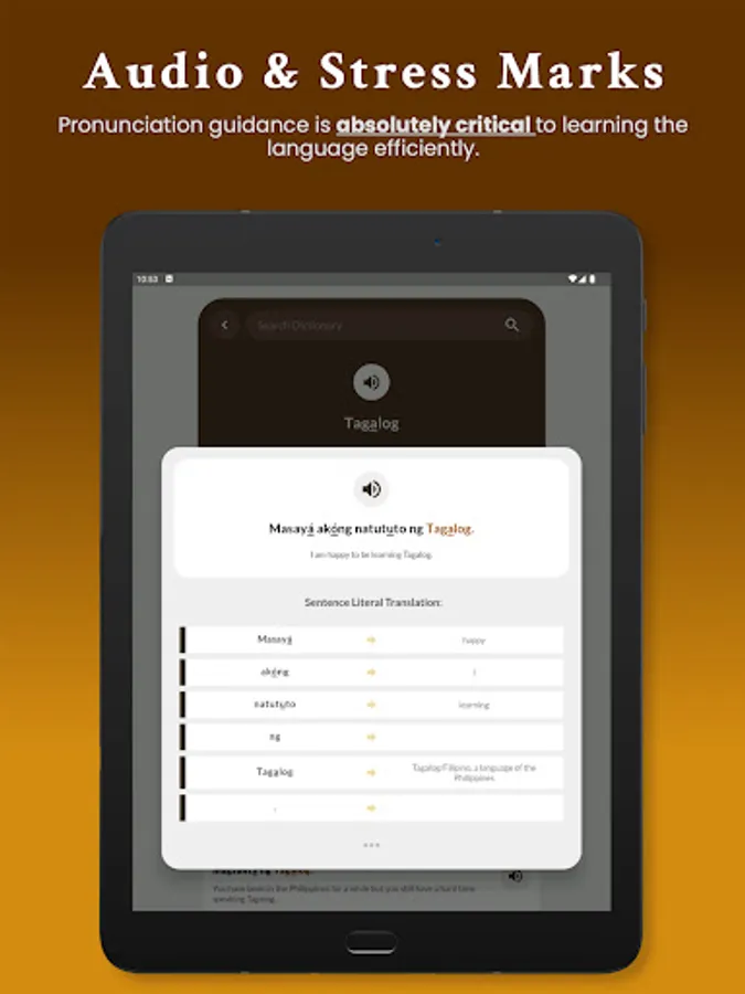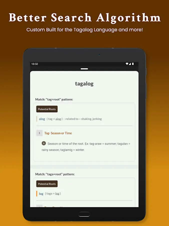 For Intermediate and Advanced learners, this app includes advanced features such as: word frequency indicators, an affix analysis program to suggest which affixes may be in use with any word you encounter, and a large searchable corpus of Tagalog texts showing real-world word use.