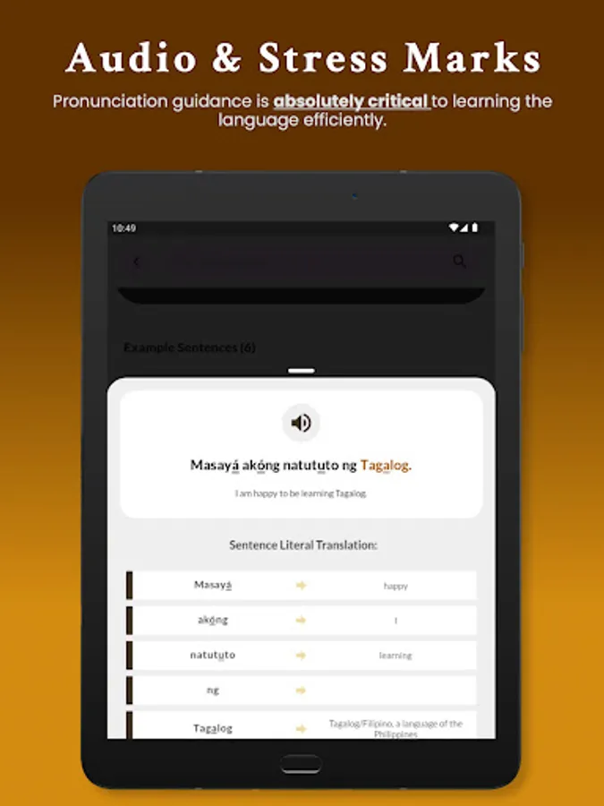 We've included tens of thousands of example audio clips by native speakers, thousands of example sentences, and pronunciation accent marks to help you learn how to speak and use the language properly.
