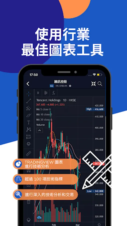 6. Gain market insights by interactive financial chartings which supports over 50 indicators for FREE and adopt technical analysis by investing specialists.