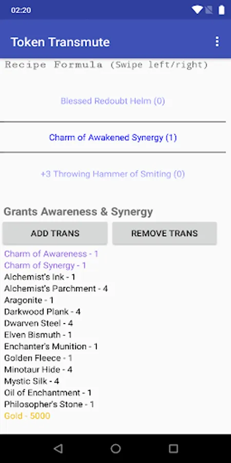 Track all your transmutes of True Dungeon tokens using this convenient app. Select your planned transmutes, input your inventory of trade tokens and other ingredients, and finally print out forms to help collect all the tokens you need to complete the operation.