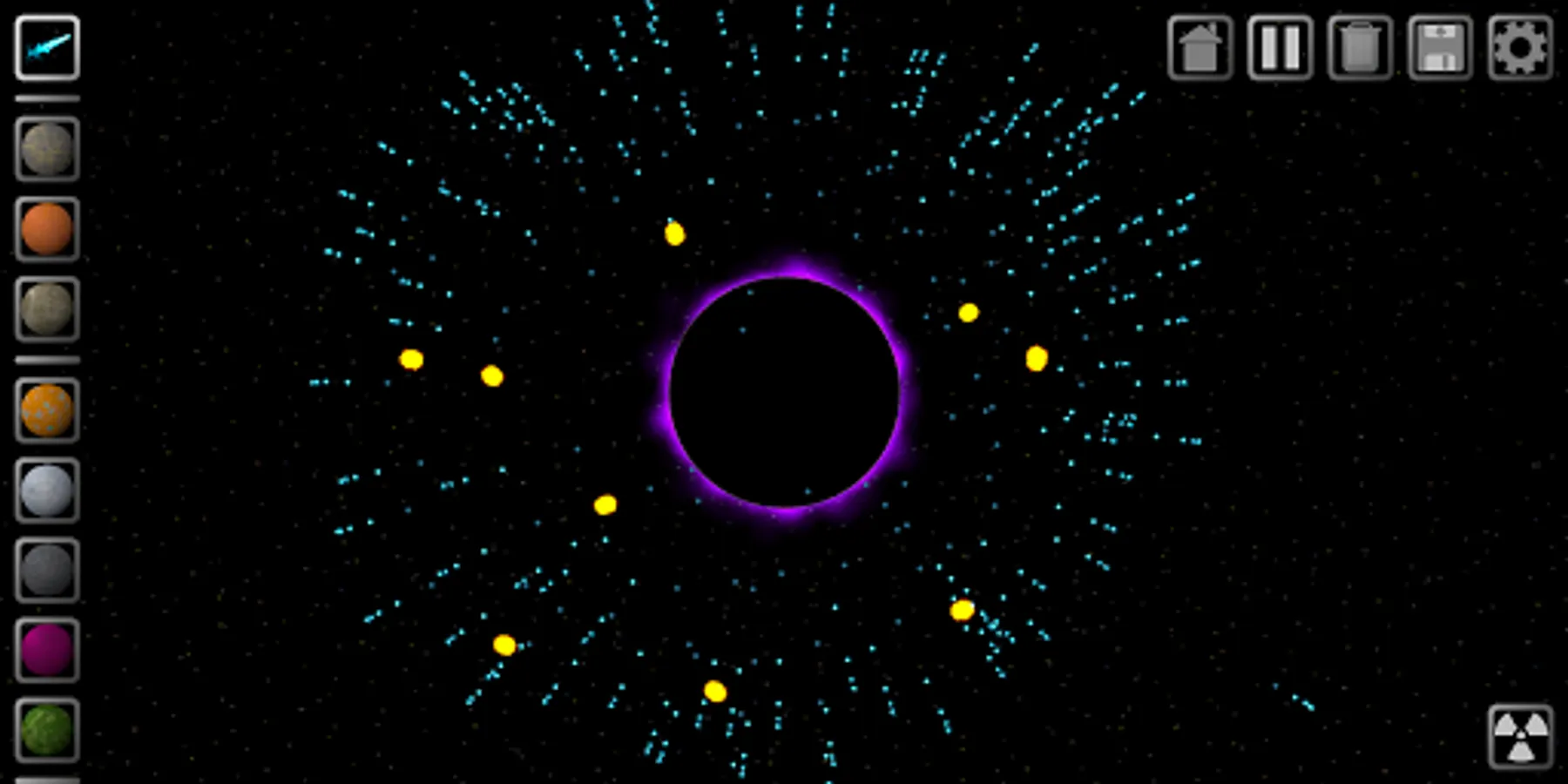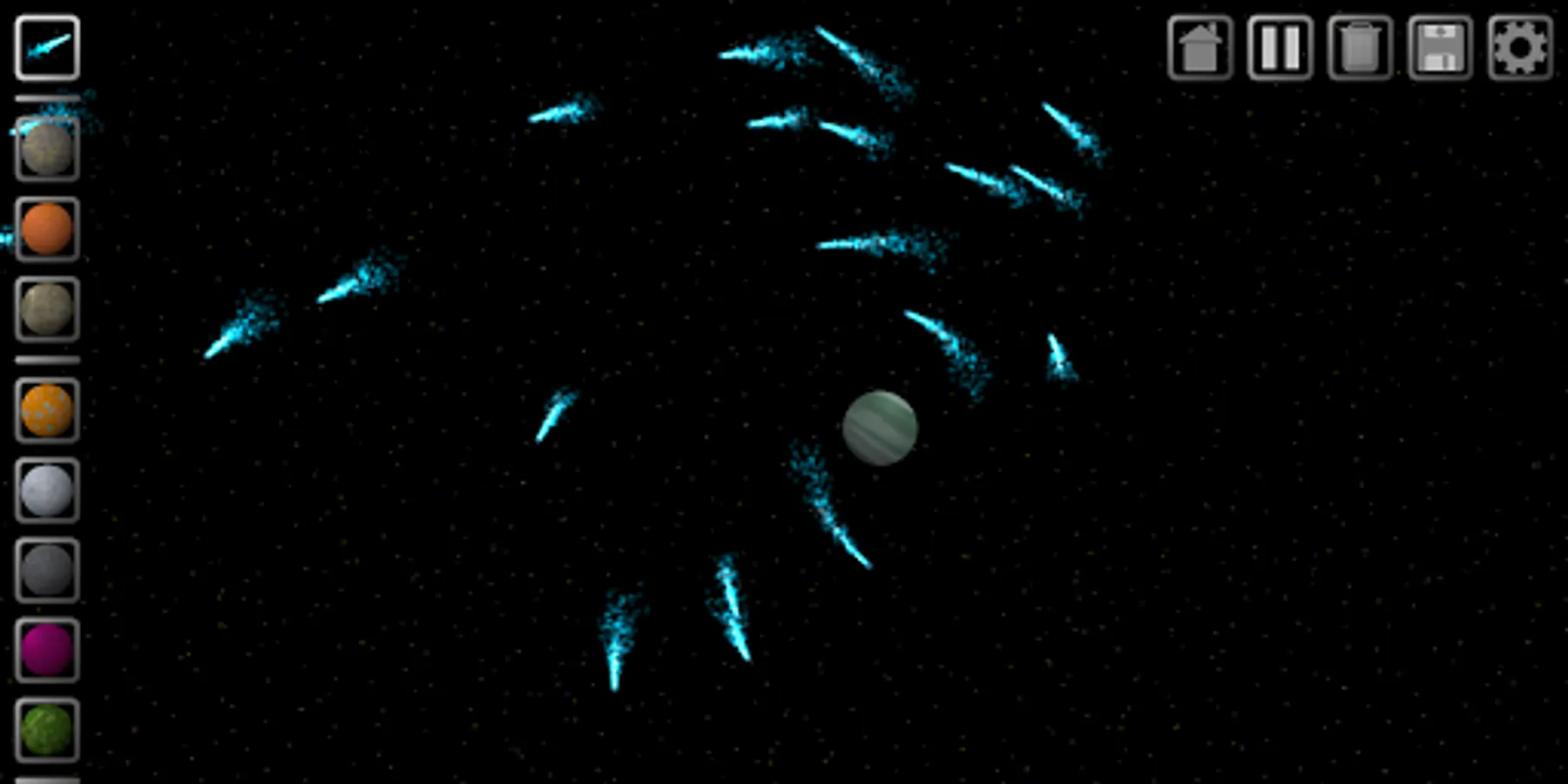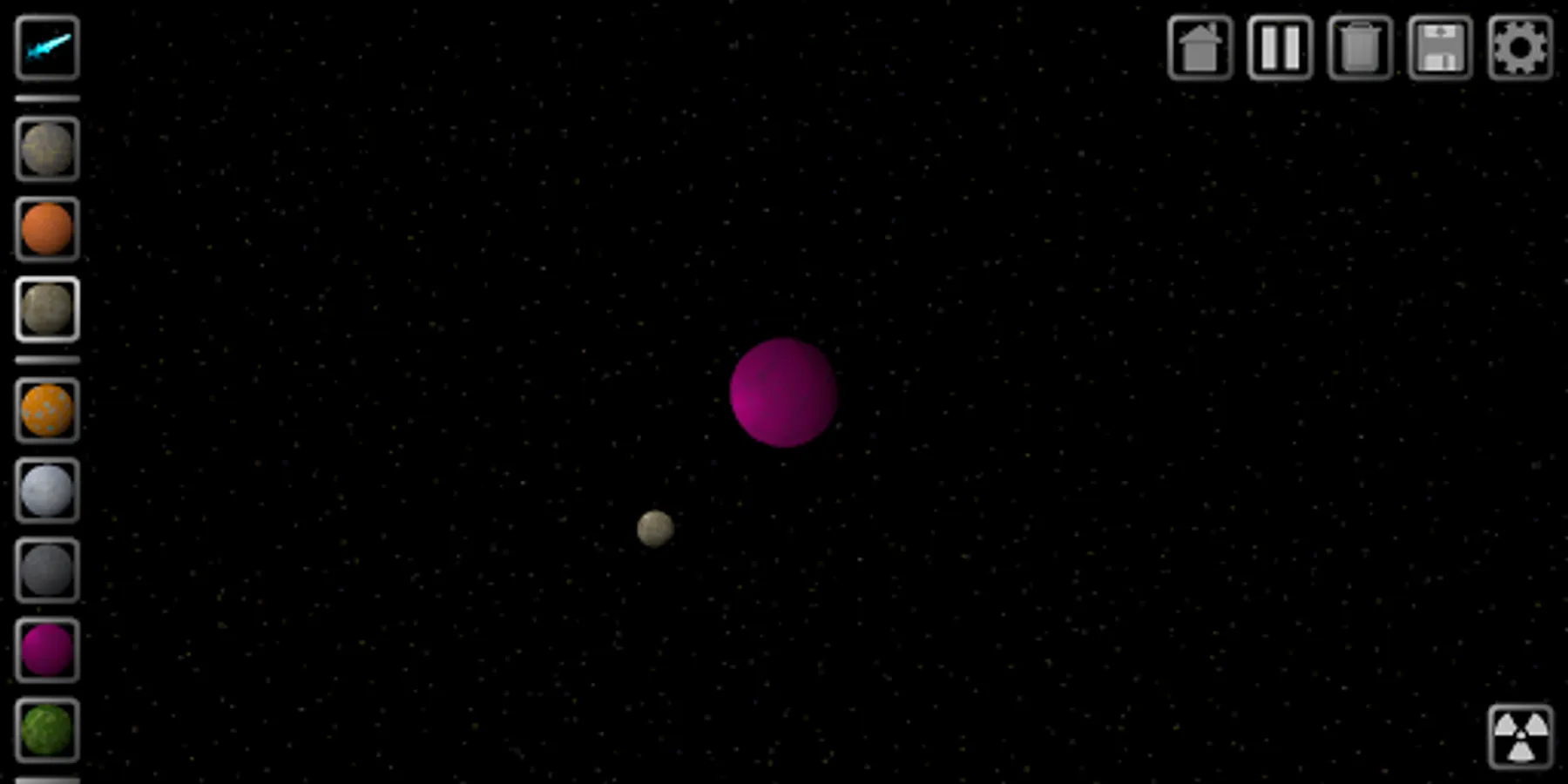 Space Sandbox allows you to create your own universe populated with comets, planets, moons, gas giants, stars, and even black holes. Watch as the celestial bodies orbit each other and collide in fiery explosions. Design everything from simple solar systems to massive galaxies. Save your favorite universes and change them later.