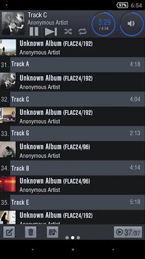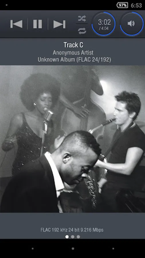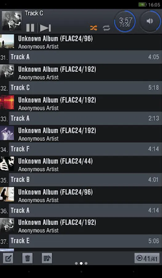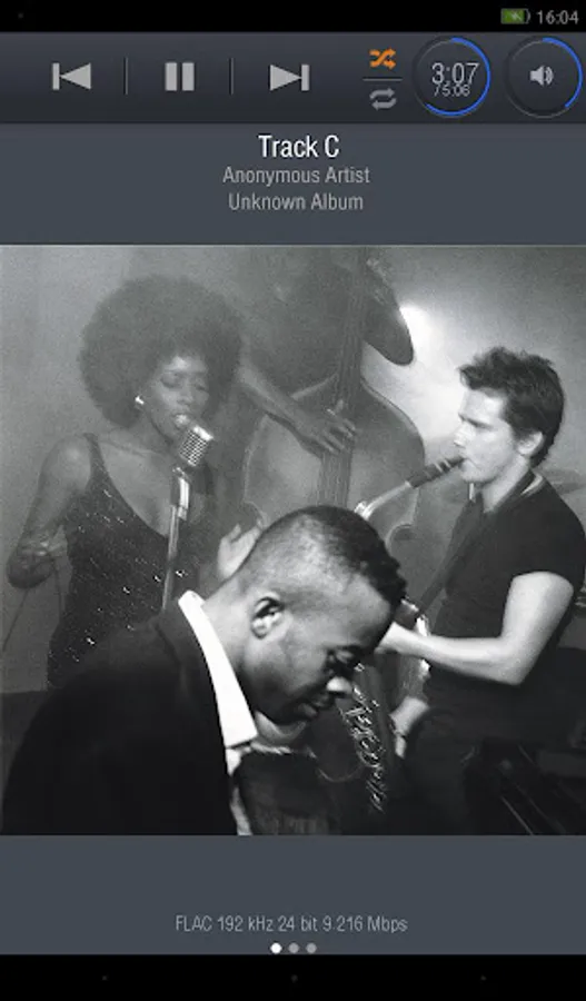 The most common playback operations - pause, skip, seek, play time, and shuffle/random play - are grouped together at the top of the screen in one panel.