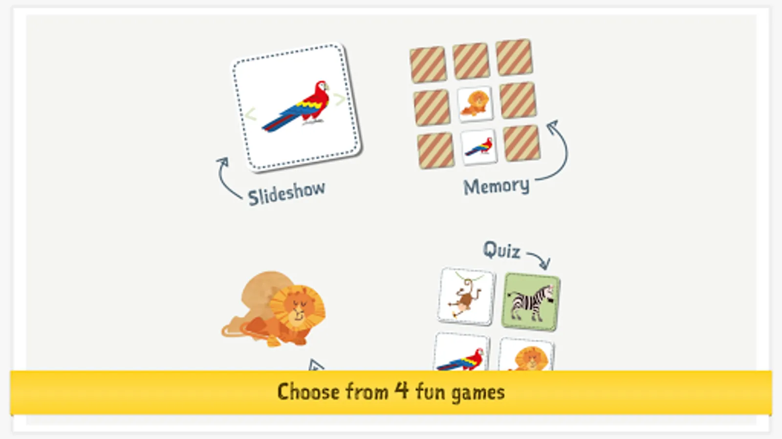 • Learn and play: challenging games (slideshow, concentration game, puzzle, and quiz).