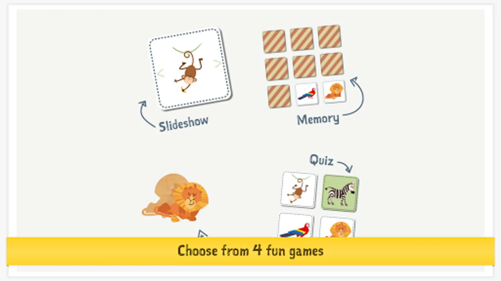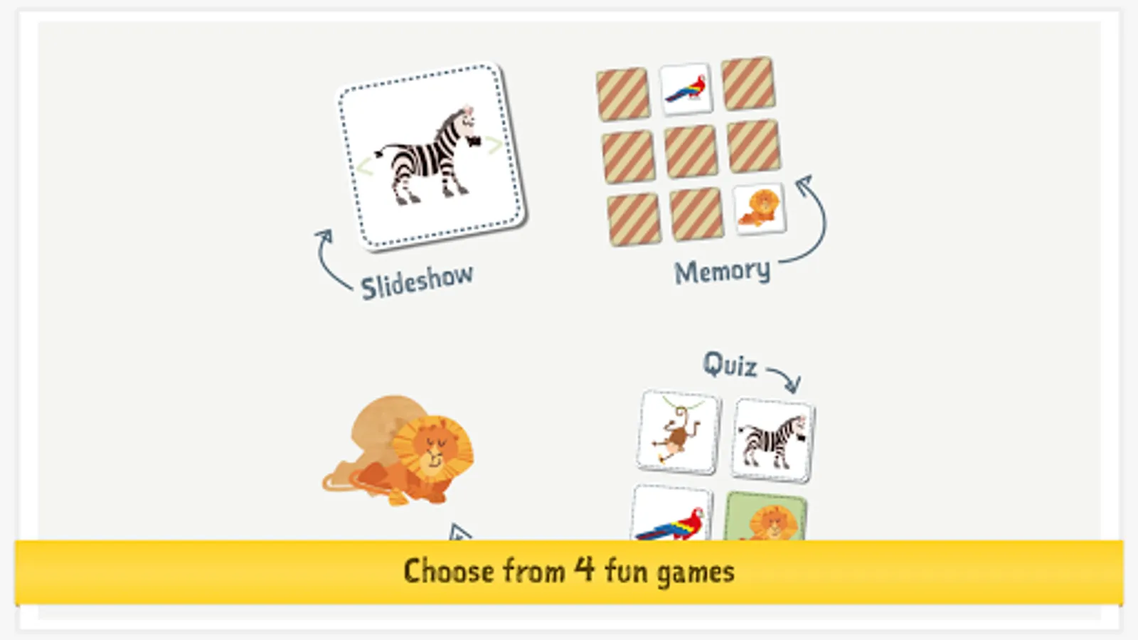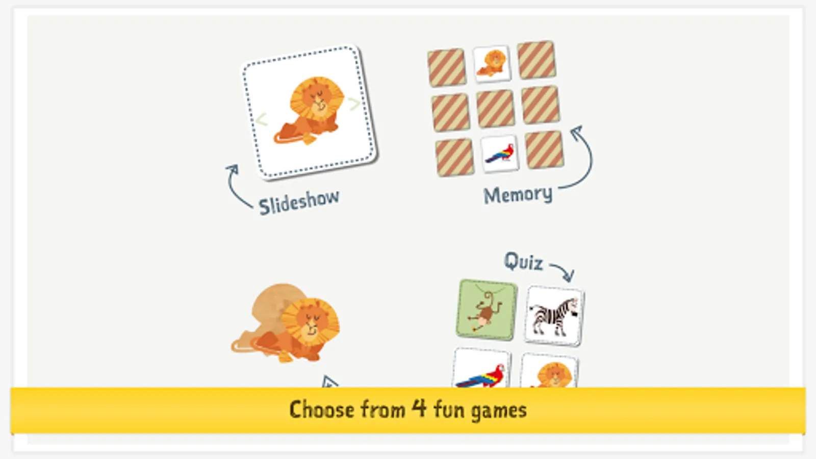 • Learn and play: challenging games (slideshow, concentration game, puzzle, and quiz).
