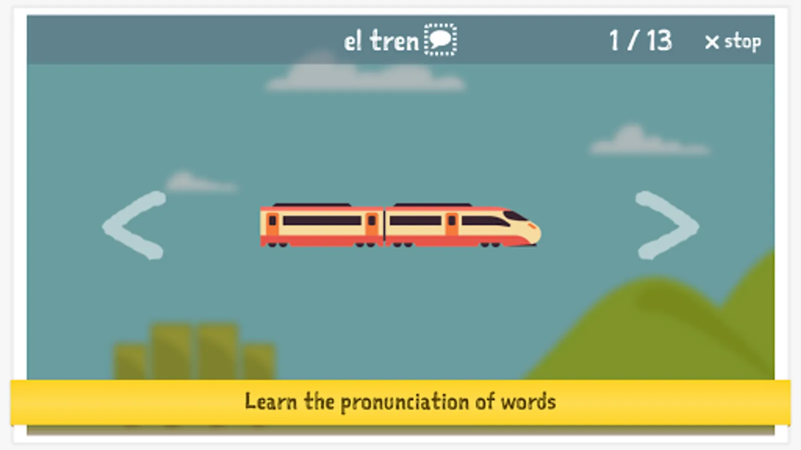 Words: automóvil, tren, camión, avión, bicicleta, autobús, helicóptero, motocicleta, velero, scooter, and 3 more!