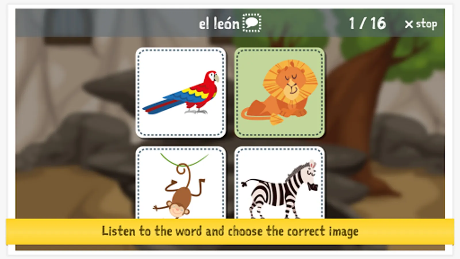 Words: loro, león, mono, cebra, elefante, jirafa, camello, cocodrilo, hipopótamo, canguro, and 6 more!