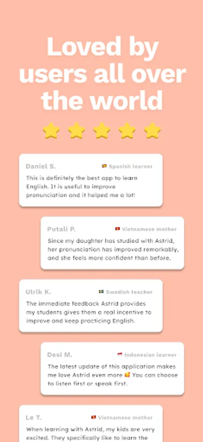 The English learning app Astrid teaches practical English skills, such as pronunciation, fluency and vocabulary, without losing the focus on fun. Astrid has certified, native English-speaking tutors present in the app to improve your pronunciation, motivate you and help you become a confident English speaker.