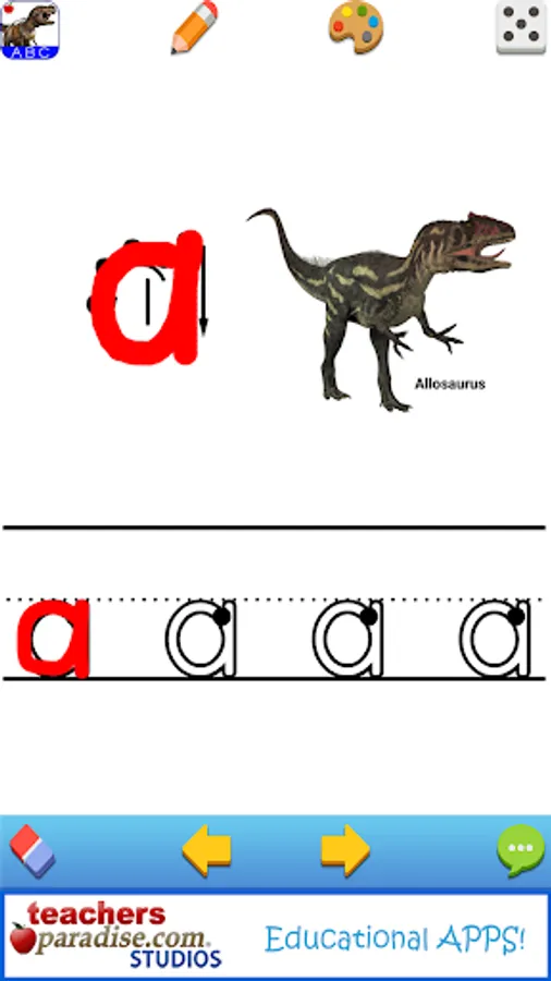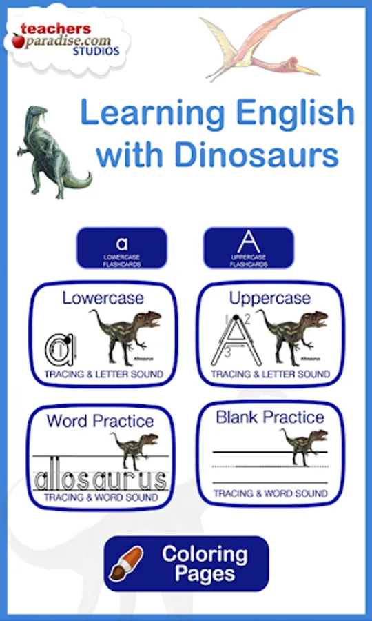 Learning English with Dinosaurs by TeachersParadise.com Studios is a game to learn the English alphabet and learn dinosaur names.