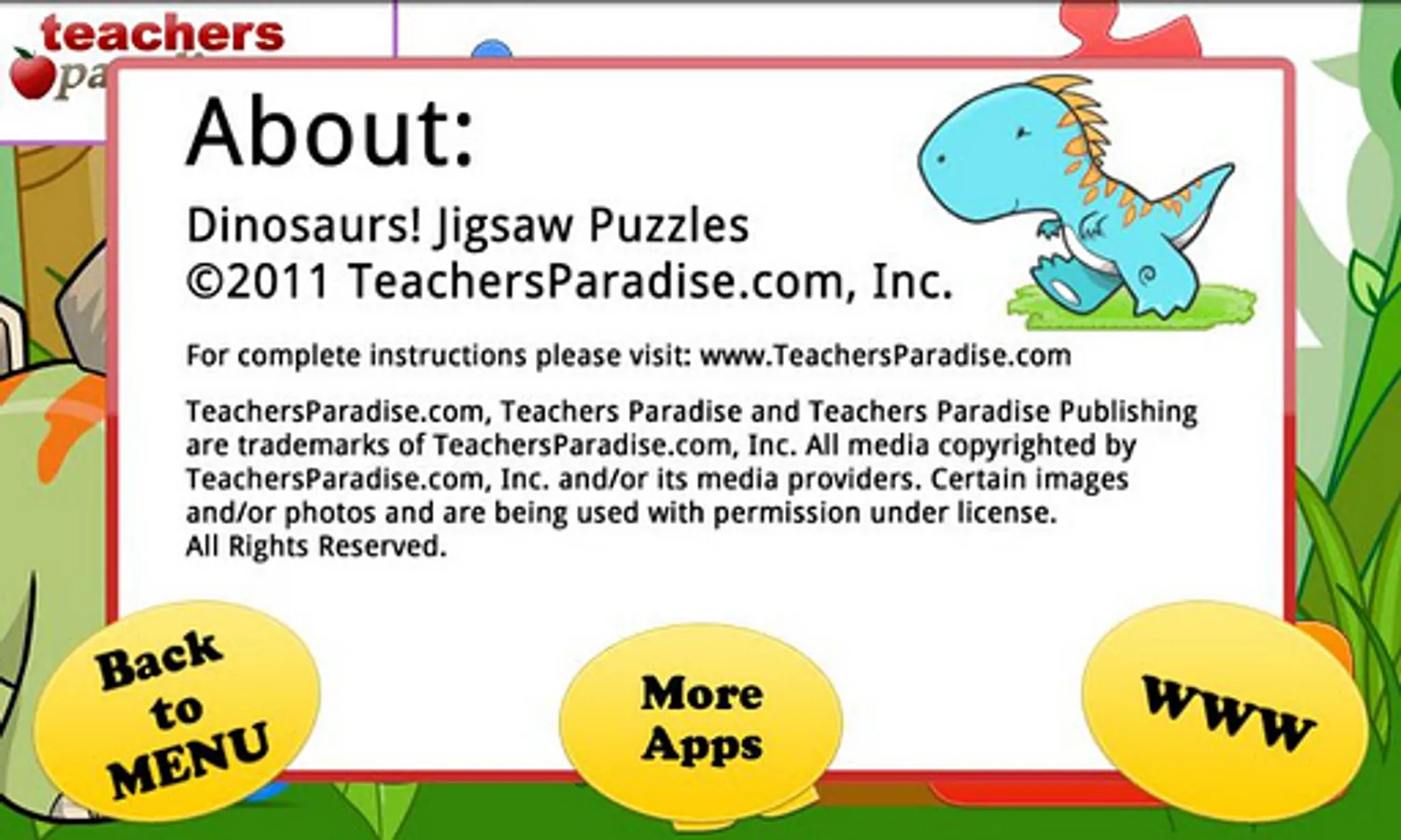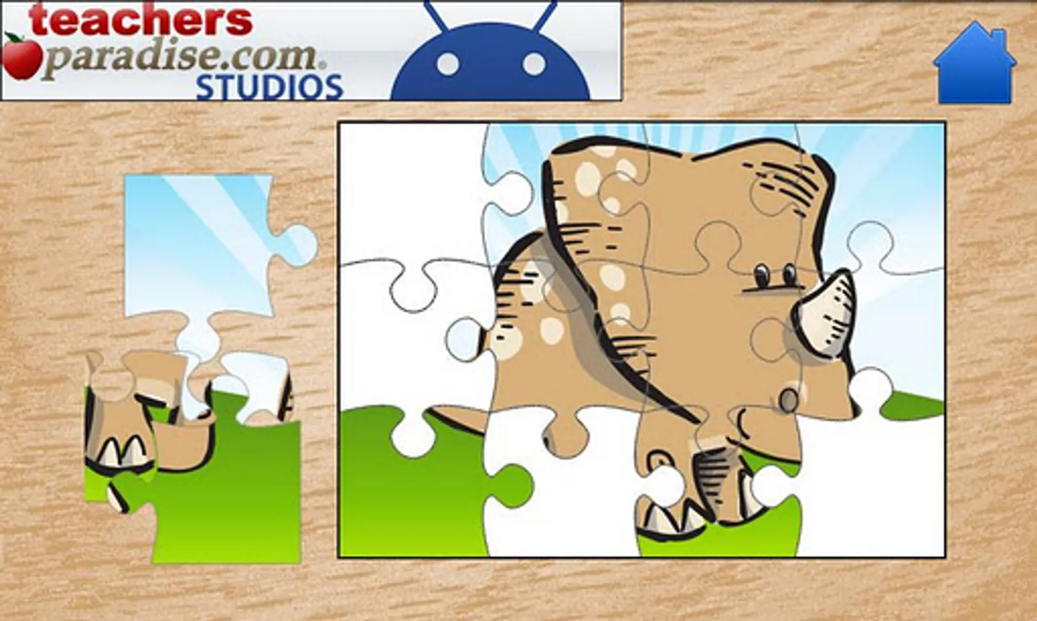 Dinosaurs are awesome. This dinosaurs jigsaw puzzles app has colorful and fun jigsaw puzzles pieces that easily snap together to make fun and uncomplicated jigsaw puzzles. After you build the jigsaw puzzle the dinosaur's name will be heard but in some "special" puzzles fun roaring sounds will be heard. Want to play again? Just shake the phone to restart the puzzle or continue to the next jigsaw puzzle!