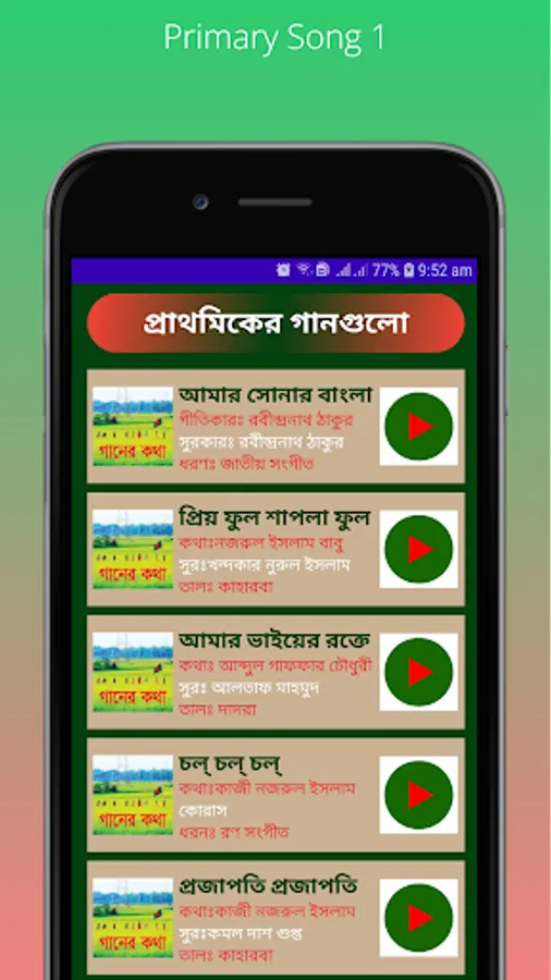 প্রাথমিকের গান অ্যাপটির মাধ্যমে আপনি প্রাথমিক বিদ্যালয়ের সকল গান কোন ধরনের মোবাইল ডাটা বা ওয়াইফাই ছাড়াই অফলাইনে বাজাতে পারবেন। জানতে পারবেন গানের গীতিকার, সুরস্রষ্টা ও শিল্পীদের নাম। নির্ভুলভাবে গাইতে দেখতে পারবেন প্রতিটি গানের লিরিক্স। সংযোজন করা আছে গানের তালের ধরণও।