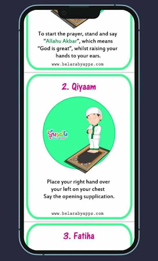 The application teaches the rak'ahs of each prayer and also teaches ablution step by step, in Arabic, French and English.