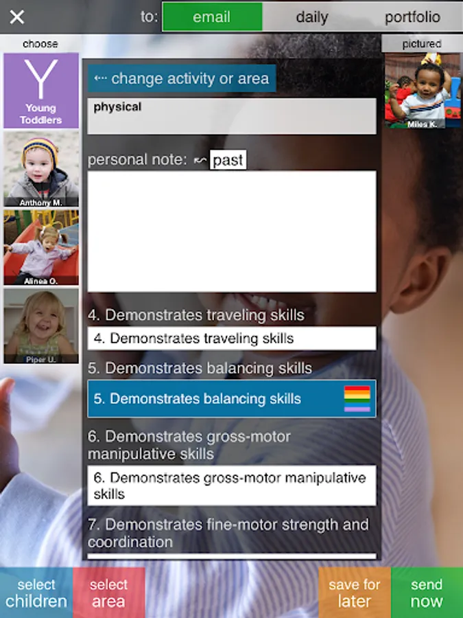 • Share captured documentation with families while simultaneously uploading it to MyTeachingStrategies®!
