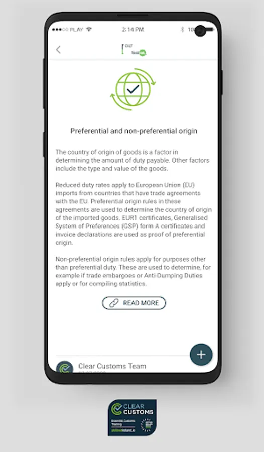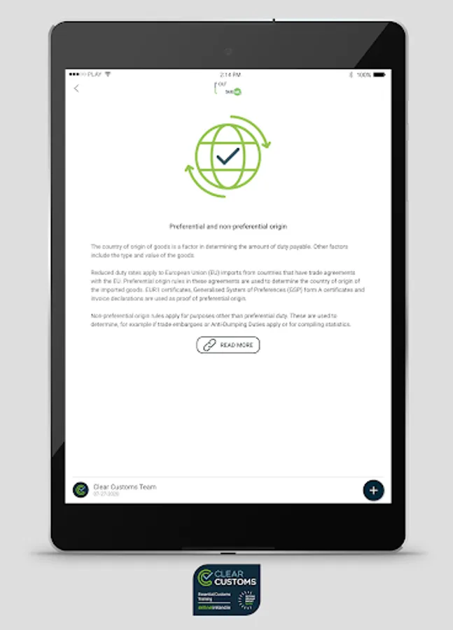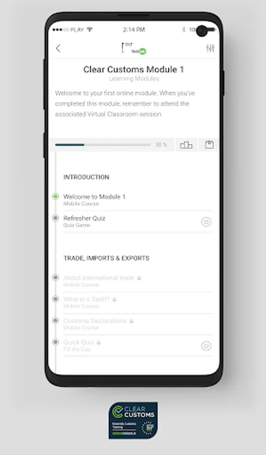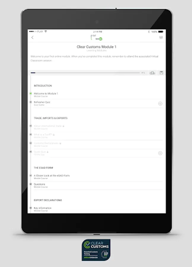 The Clear Customs mobile app provides learners on the programme with on-the-go access to engaging and meaningful content about customs declarations. The easy-to-access, easy-to-use content will reinforce and enhance your customs knowledge using a variety of activities such as quizzes, videos, checklists and practice exercises. Used in conjunction with the virtual classroom sessions delivered by expert customs practitioners, this app provides a next-generation mobile learning experience.
