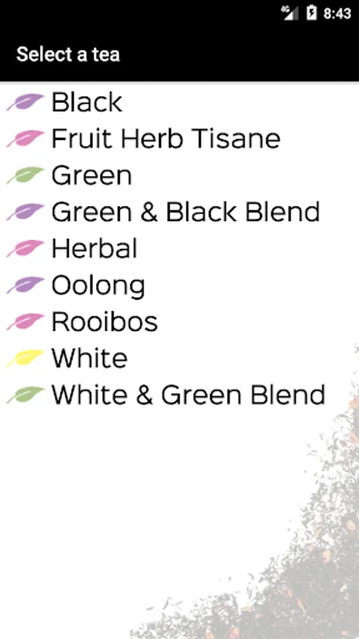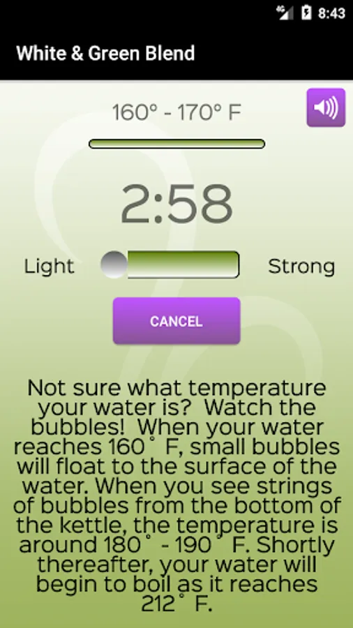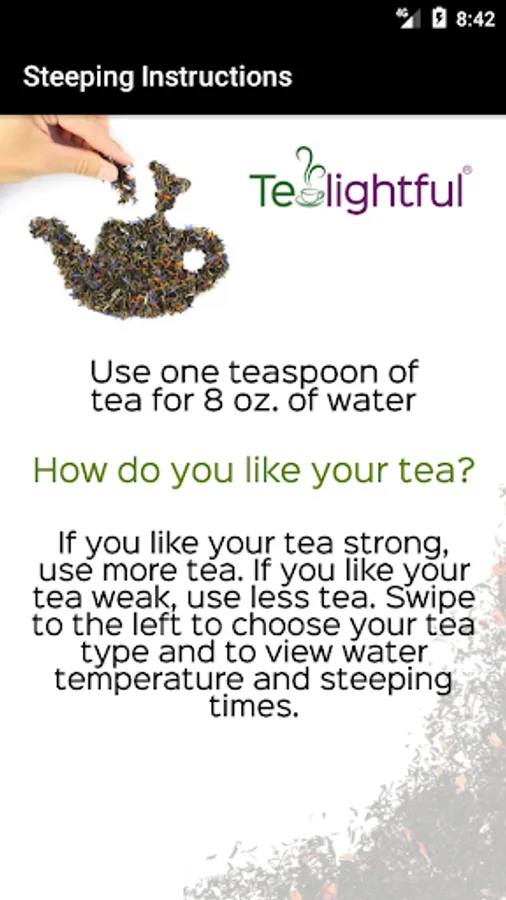 This application provides customized steeping times for all varieties of loose leaf teas. It displays rotating facts about tea during the steeping process and has background music and bell sound effects when the steeping process has completed. Steeping times may be manually adjusted through the recommended steeping time range according to your specific taste.