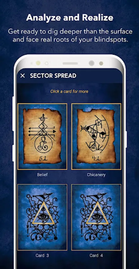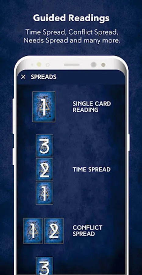 4. Guided Readings - the app features unique never before seen spreads that help you gain awareness on topic like - your needs, wants, conflicts, blocks on giving & receiving love, physical body, etc.
