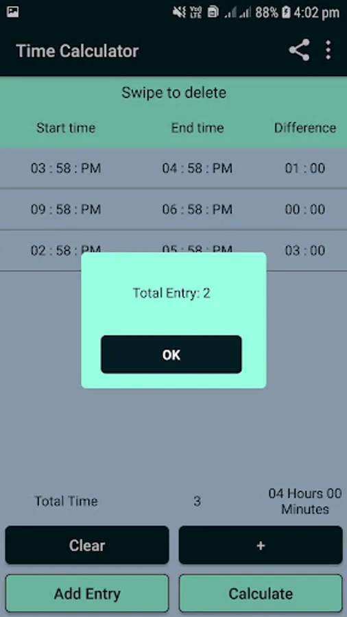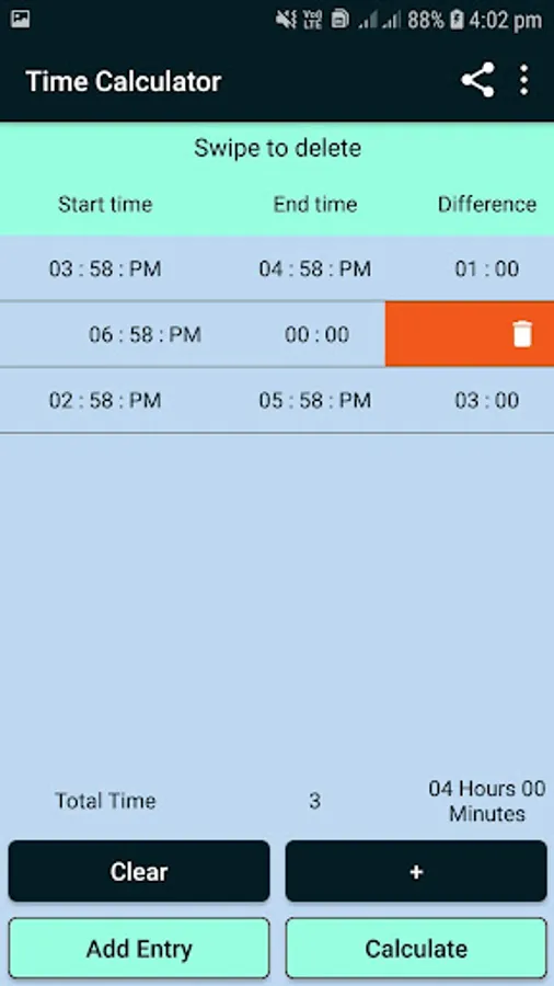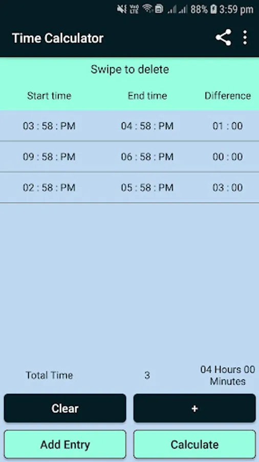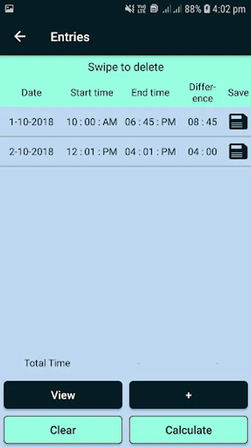 ↪ You can add and save the multiple date and time as entry in phone: You get the elapsed hours and minutes of each time entry and you can get the total elapsed hours and minutes for entries you want.