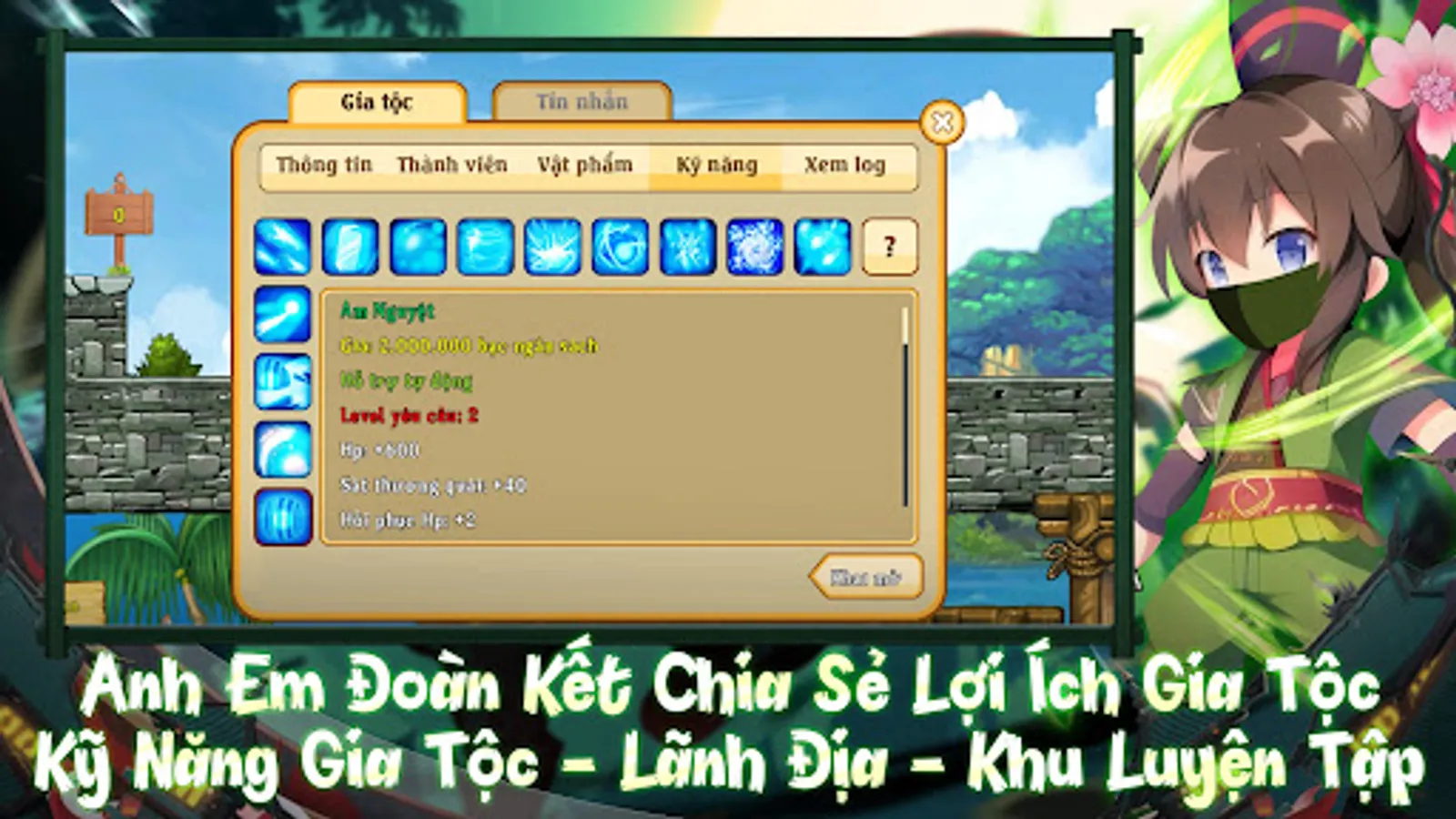 - The Clan system supports players to unite and develop together with clan stock, clan skills and benefits from clan territory, clan practice area.