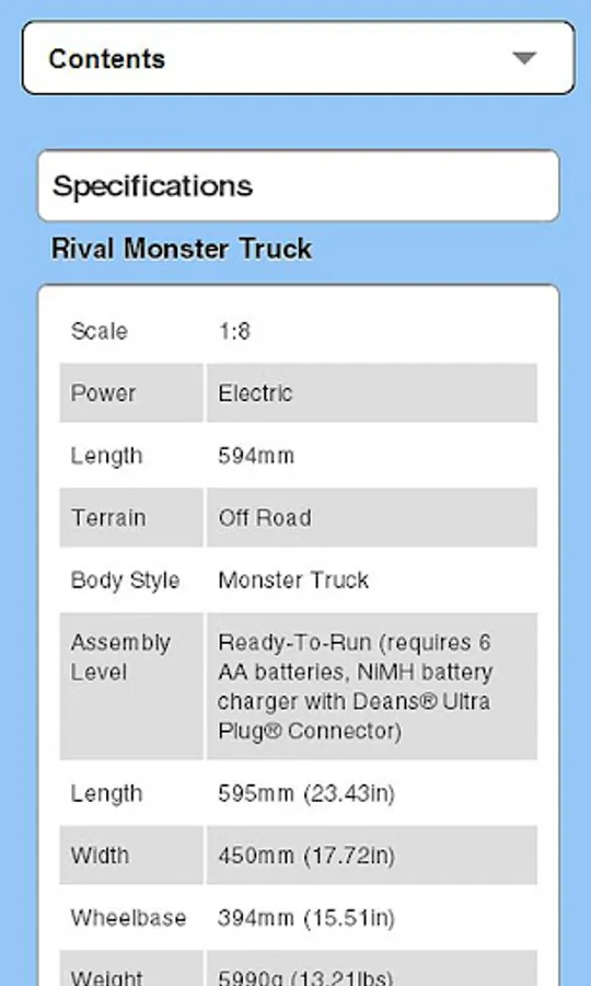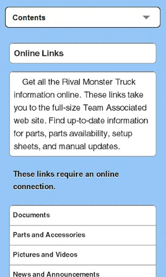 If you already own the Team Associated Rival Monster Truck, you'll have plenty of resources at hand if you need to fix the truck, tune it, or understand how things work. You'll be able to show it to friends who want to know more about your truck. You won't spend time and bandwidth looking up the docs on your device; they are all here in-app and sized to fit. (However, the parts list will be most difficult to view on small screens.)