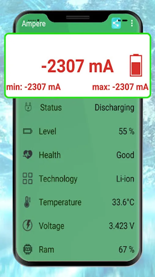 When connecting the battery charge source, the "Ampere" ("test charger") application automatically estimates the% of the remaining PIN space and displays the Maximum and Minimum PIN capacity values on your Android phone.
