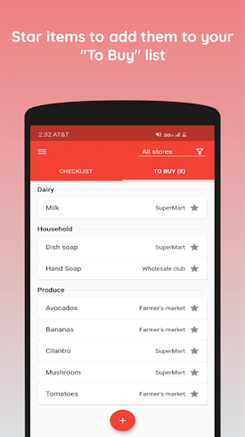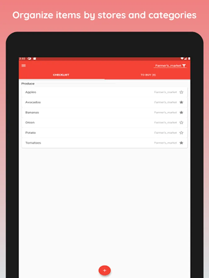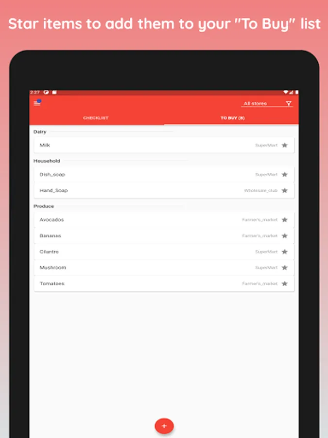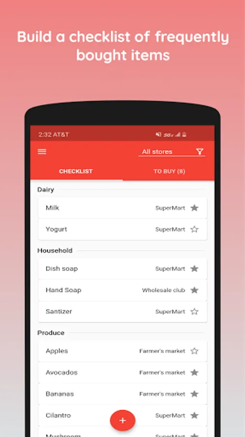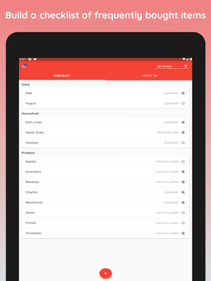 - Build checklists of frequently bought items, and move them to-buy lists when needed