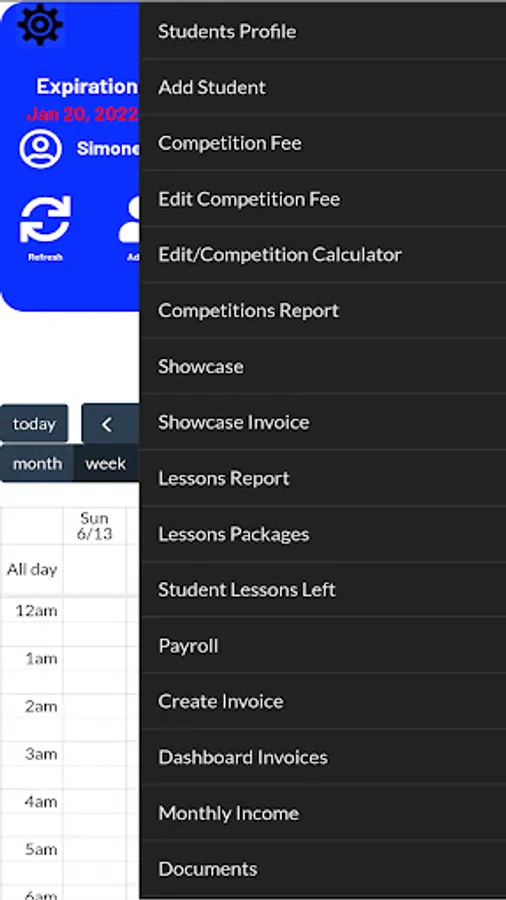Different Menu for Admin and Students. The students can see just the own lessons on the calendar, competitions done, Lessons left.