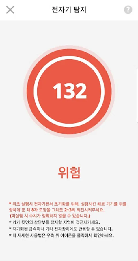 4-1) When detecting electromagnetics higher than usual, the measuring system turns yellow. In this case, it has detected weak electromagnetic waves, and a small camera or other all-terrain electronic device and metal may be located near the mobile phone.