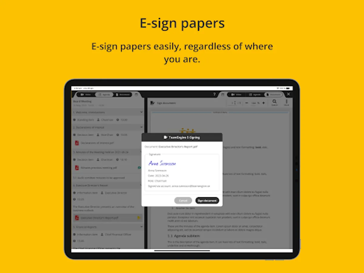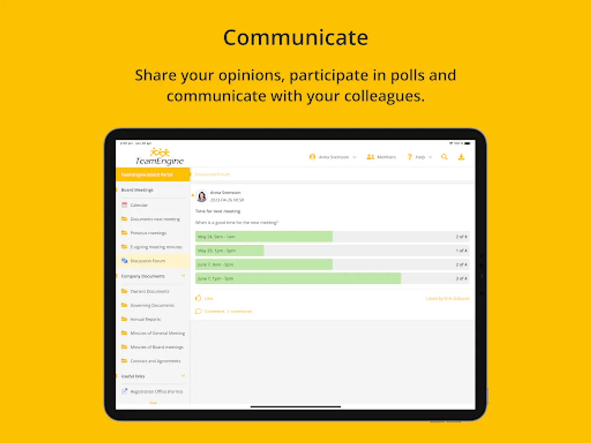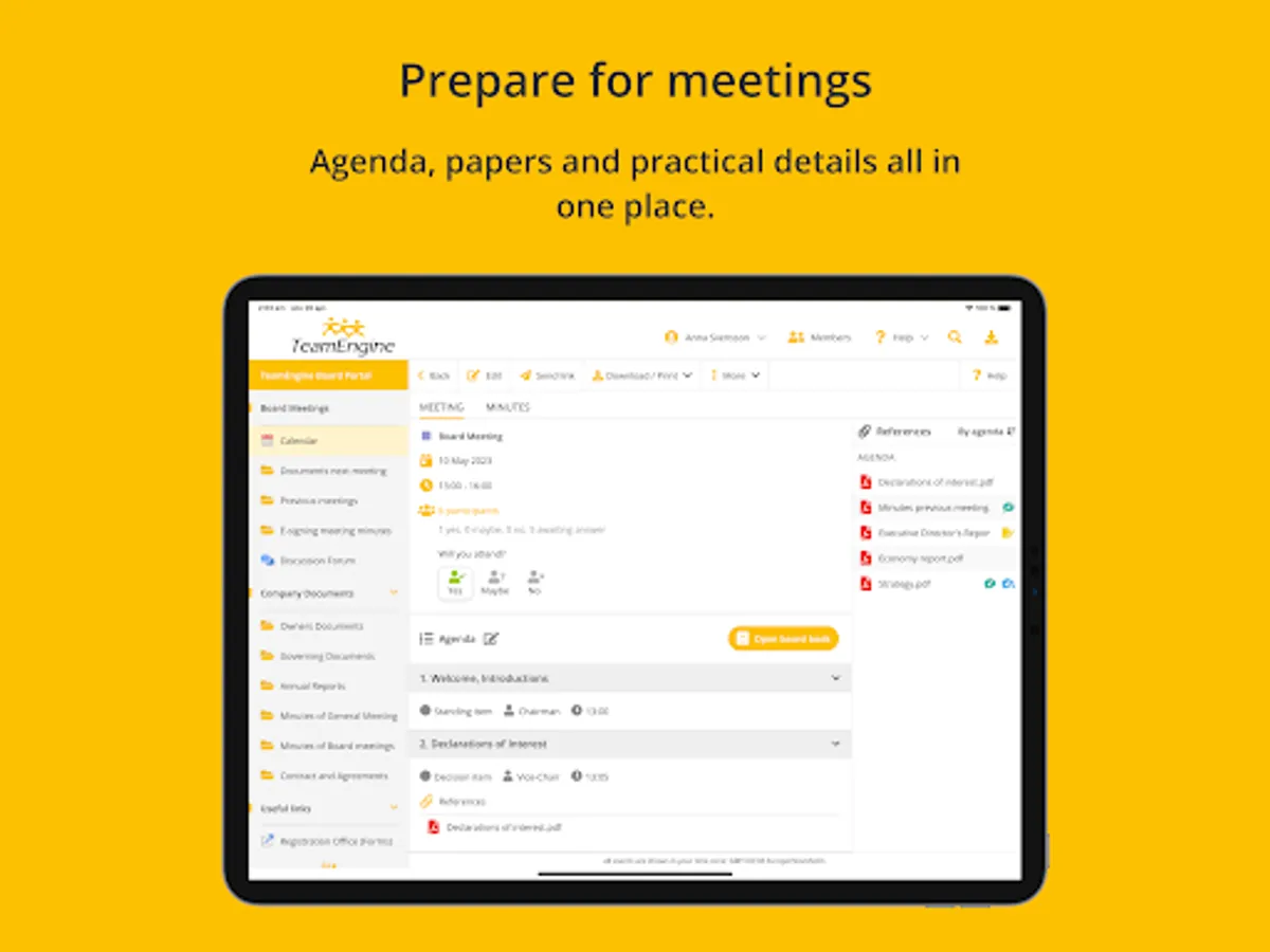 Get a clear overview of all future meetings and access agendas, papers and practical details all in one place. Read papers and make annotations that can easily be shared with other members. Download files and board packs to access them offline. You can e-sign papers with a secure digital signature, regardless of where you are. Use forums in your portal to share your opinions, participate in polls and communicate with your colleagues.