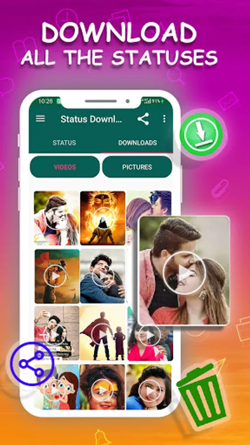 Ever Happened when you liked any status from WA and you have to ask every time for sending you. Well your problem is solved with this Status Saver. With This Status Saver for WA you can download video and picture of your friend then you just need to open this Status Saver app and here you will see Video and Picture separately and there are two tabs for Status And Downloads so you can check downloaded statuses in Download Tab. This app allows you to repost status in WA and share with other medium. Also you can check status of Dual WA and Business WA. It has in-built Video Player where you can play your Video Statuses.
