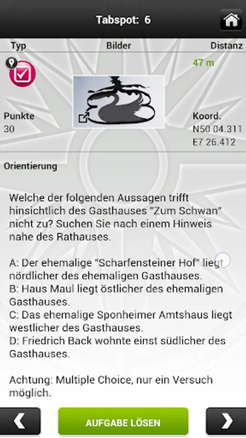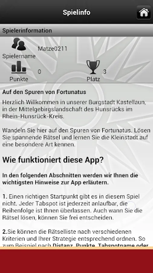In an event, all teams get a Tablet-PC with this special tabtour application. The Tablet PC allows participants in first line to orient themselves, to navigate to tabspots, login to tabspots and to solve exciting riddles.