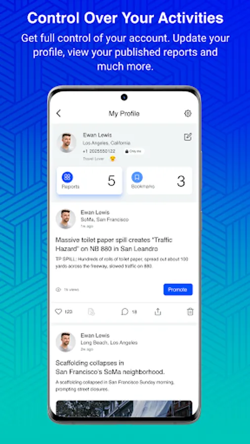 Get full control of your account by a few taps. Update your profile, view your published reports, invite your friends and much more.