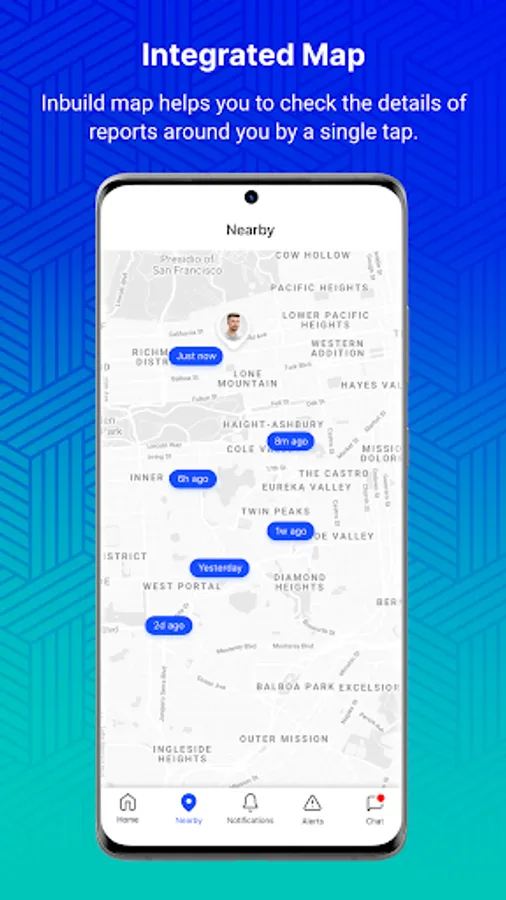 View the number of reports around you. In build map helps you to check the details of reports around you by a single tap.