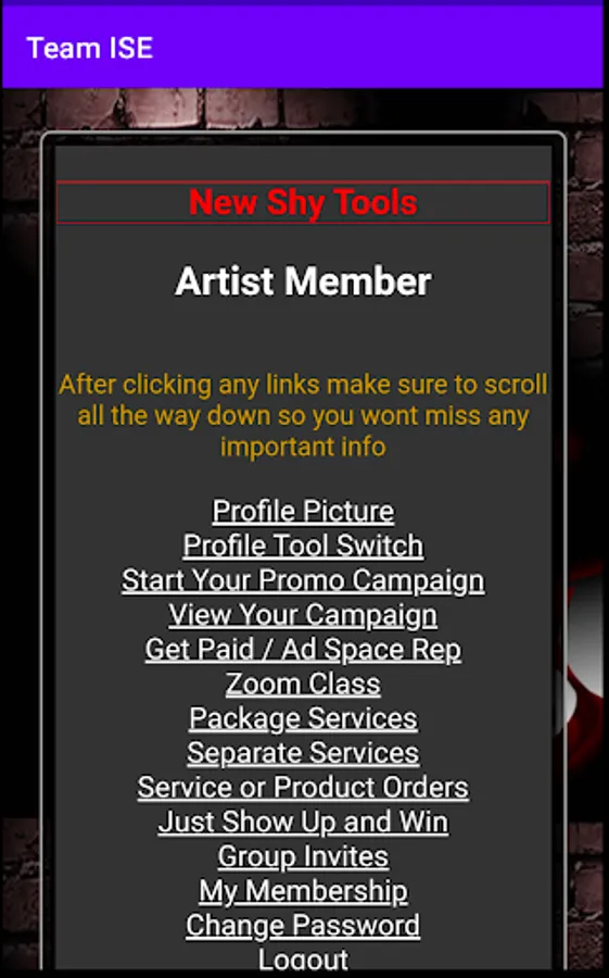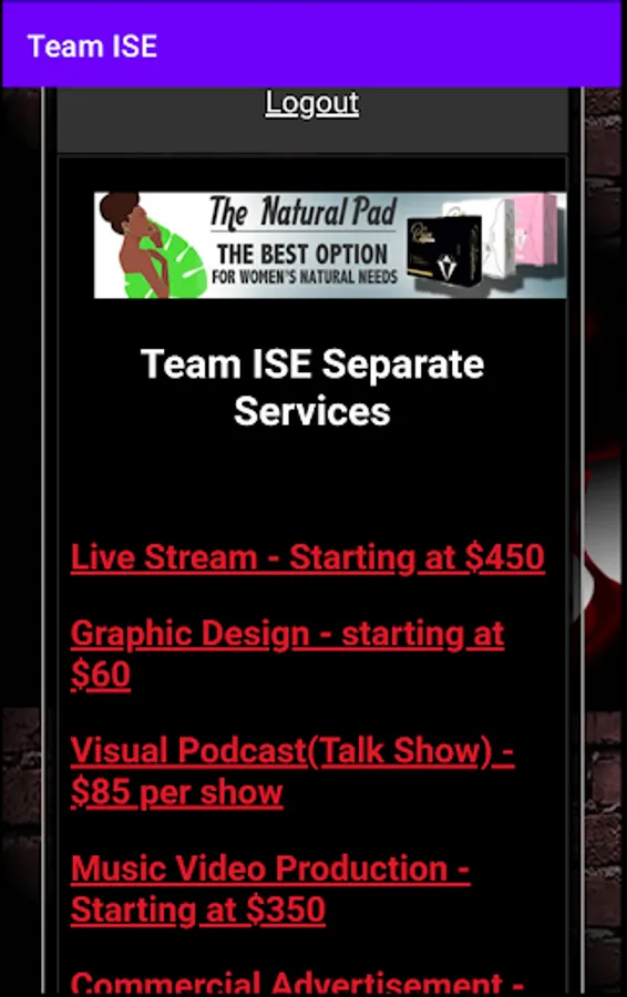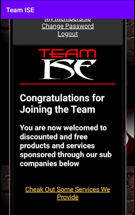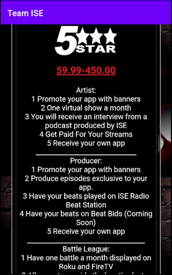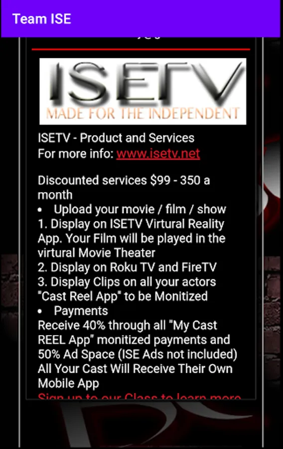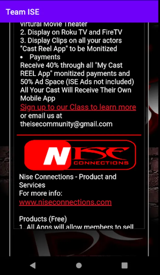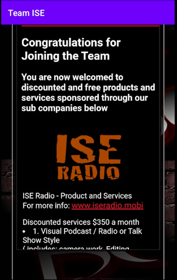 Team ISE App will allow all team members to control all services, products, shows and event created by ISE. The app will display Team ISE events,news,and shows and also provide information on any endeavor that includes Team ISE. Which might include promo discounts and prizes.