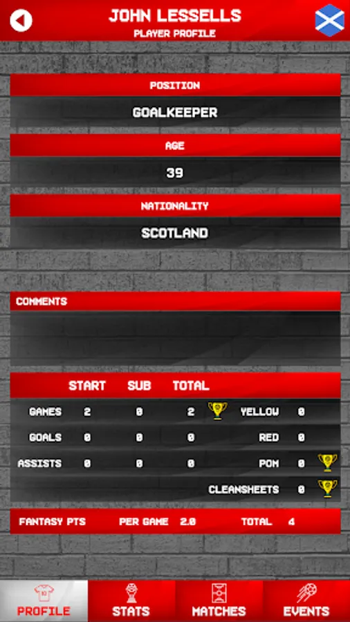 Matches - keep records of all games including goal and assist information, player ratings, line-ups, substitutes, formations and more!