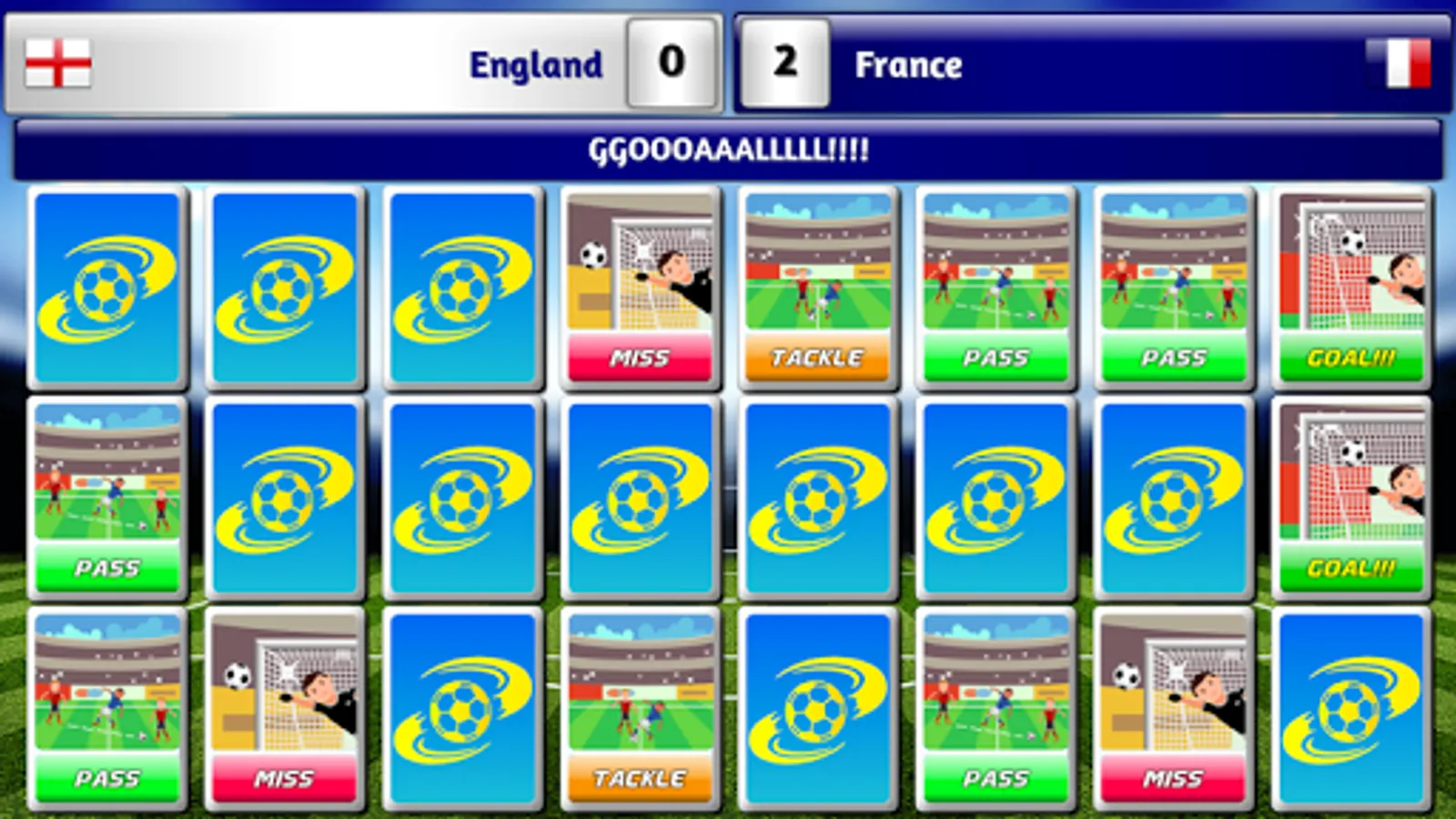 Players need to pick cards to create chances and score the goals to take your team to glory! There's penalties, fouls, tackles and more to keep the match entertaining, and also the 'Random Reveals' can be used to give your team the edge!