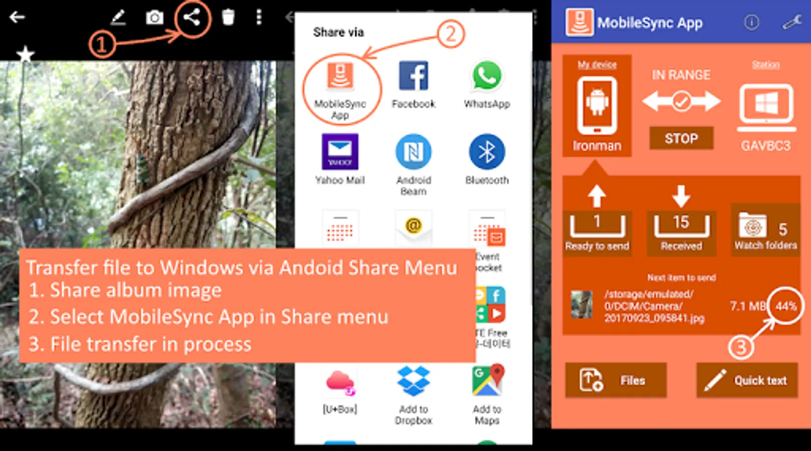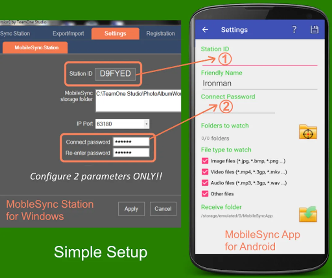 It will connect to MobileSync Station which is running in Windows. Setup ONCE and any files can be easily transferred to Windows by Android Share menu. Similarly, files and folders can be transferred to Android devices through Windows context menu or by simple drag and drop operation in Windows.