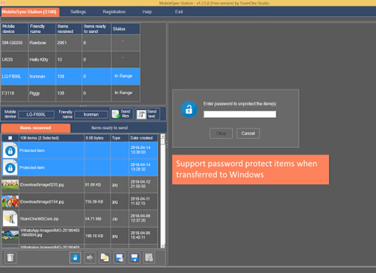 MobileSync App supports password protect files and folders when transferred to MobileSync Station in Windows. This securely safeguard sensitive information in mobile device and protect user privacy. Nobody except the mobile device owner can access and read those files and directories that have been protected by the his/her password configured in the app.