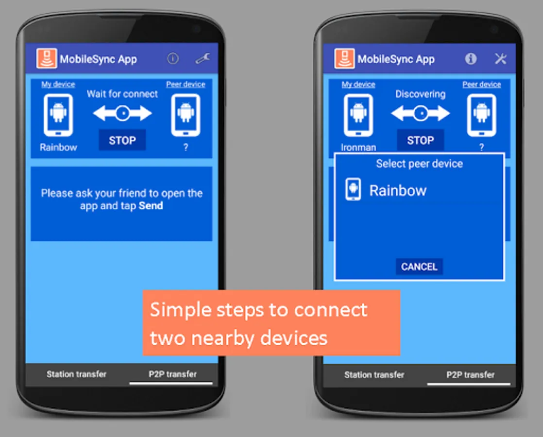 MobileSync App users can also share files and folders between Android devices through Wi-Fi Direct technology in P2P transfer. No mobile data will be used and there is no need to connect to any wireless access point nearby.