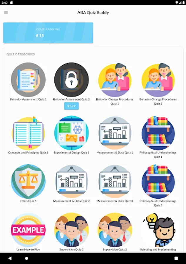 ABA Quiz Buddy tests your knowledge on key focus areas and helps increase your fluency. Answer questions correctly and quickly to earn more points! The more points you earn, the higher you’ll rank on the leaderboard!