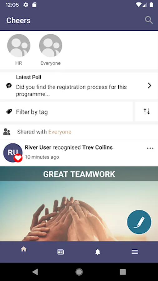 The new Cheers! app, created by River, is an exciting tool providing up to date news and a slick social environment where employees and managers can both recognise each other and their actions in the work place. The app also allows users to comment and like new content and recognitions - a great way for other users to show their appreciation too. Other features includes the ability to comment and engage with other users on news articles.