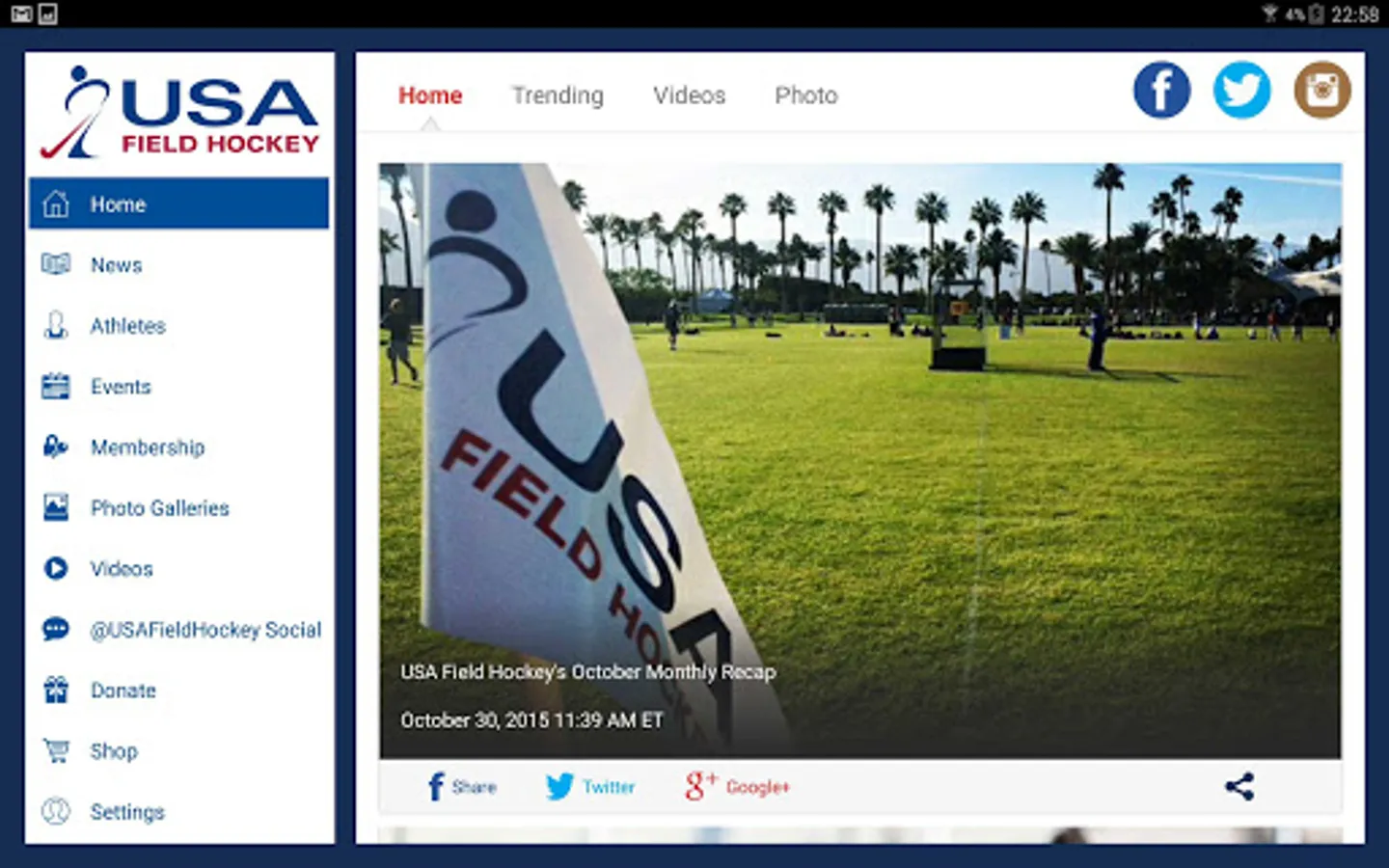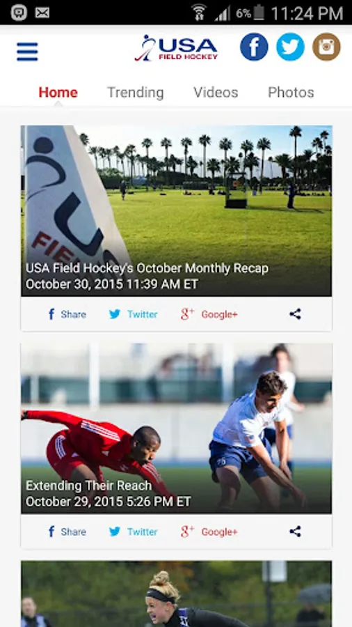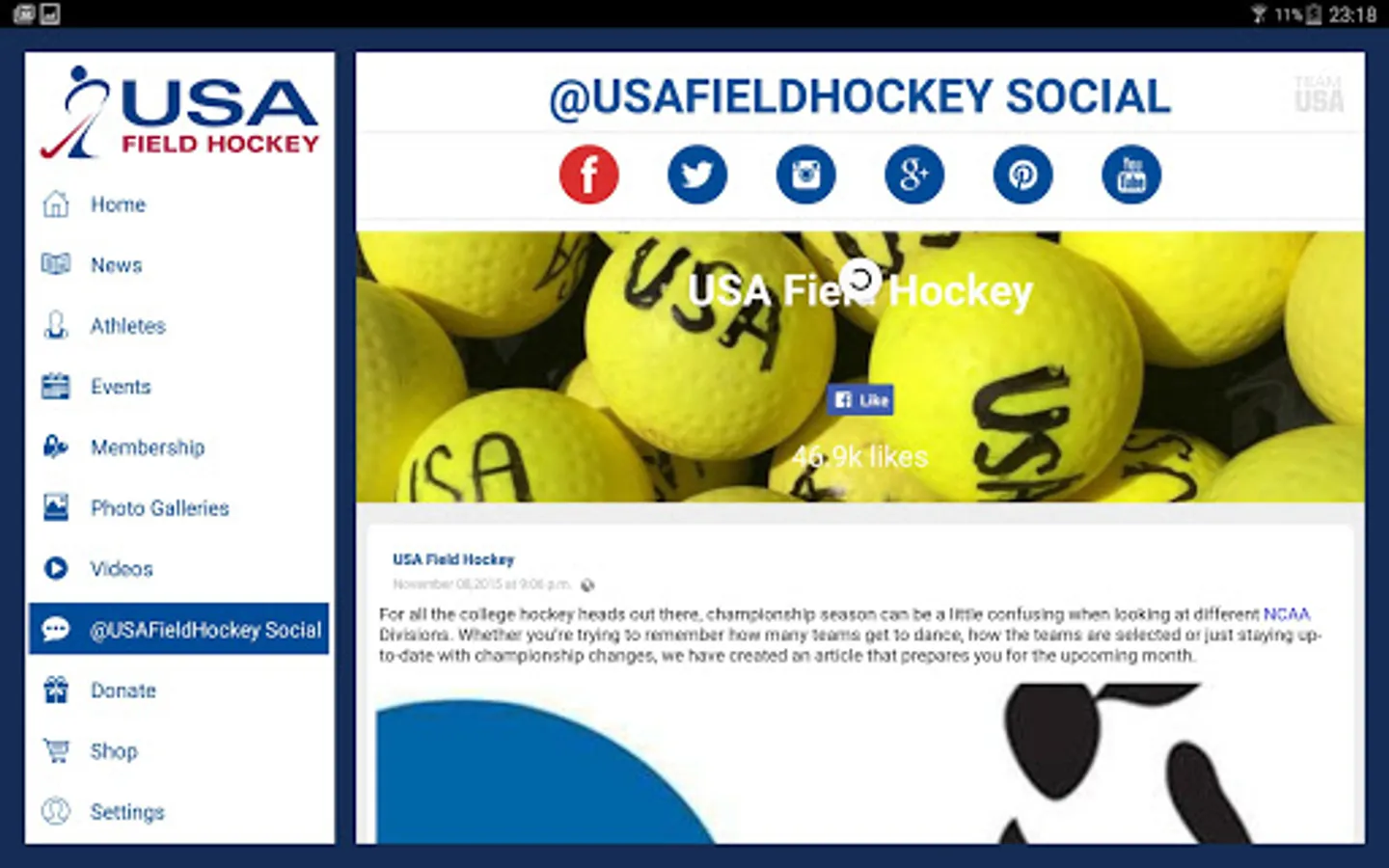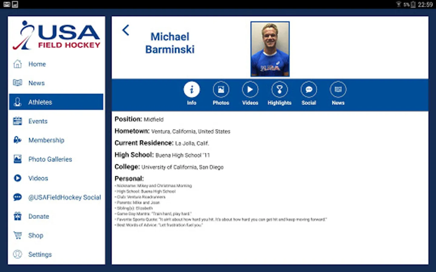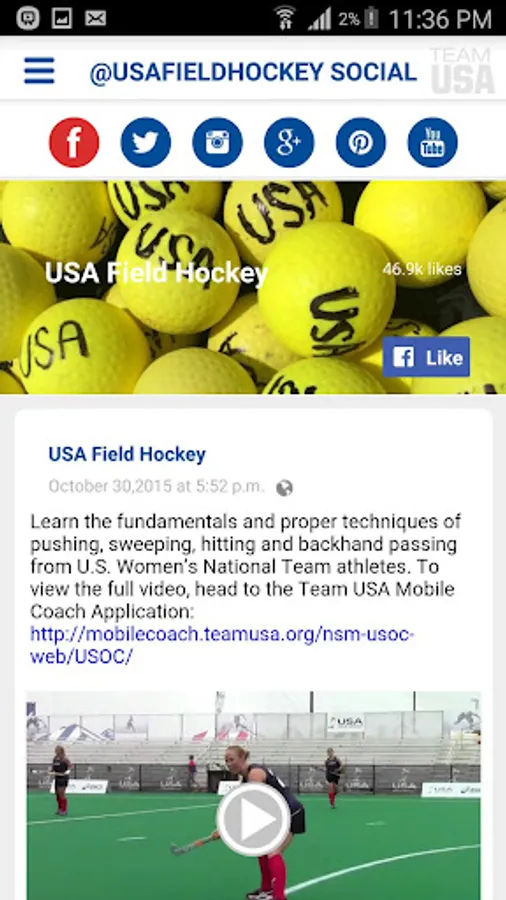 The USA Field Hockey App provides athletes, coaches, umpires and fans with updated events and results information, breaking news and inspiring stories across the country and the world. As the official hub of hockey within the United States, you’ll find a stunning display of videos, photo galleries and features of our national team athletes and familiar faces from your backyard. With easy navigation and social media integration, the USA Field Hockey App is excellently crafted for the field hockey lover on the go!