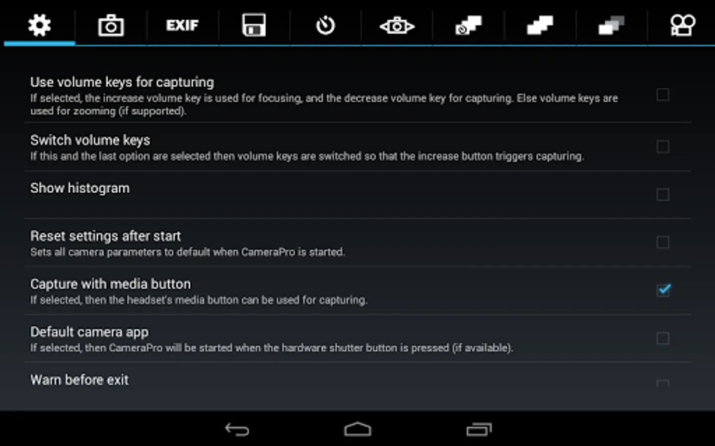 CameraPro offers fast access Android camera features. It is highly customizable including different designs and menu arrangements, supports various overlays including histogram, virtual horizon, level meter, compass, and much more.