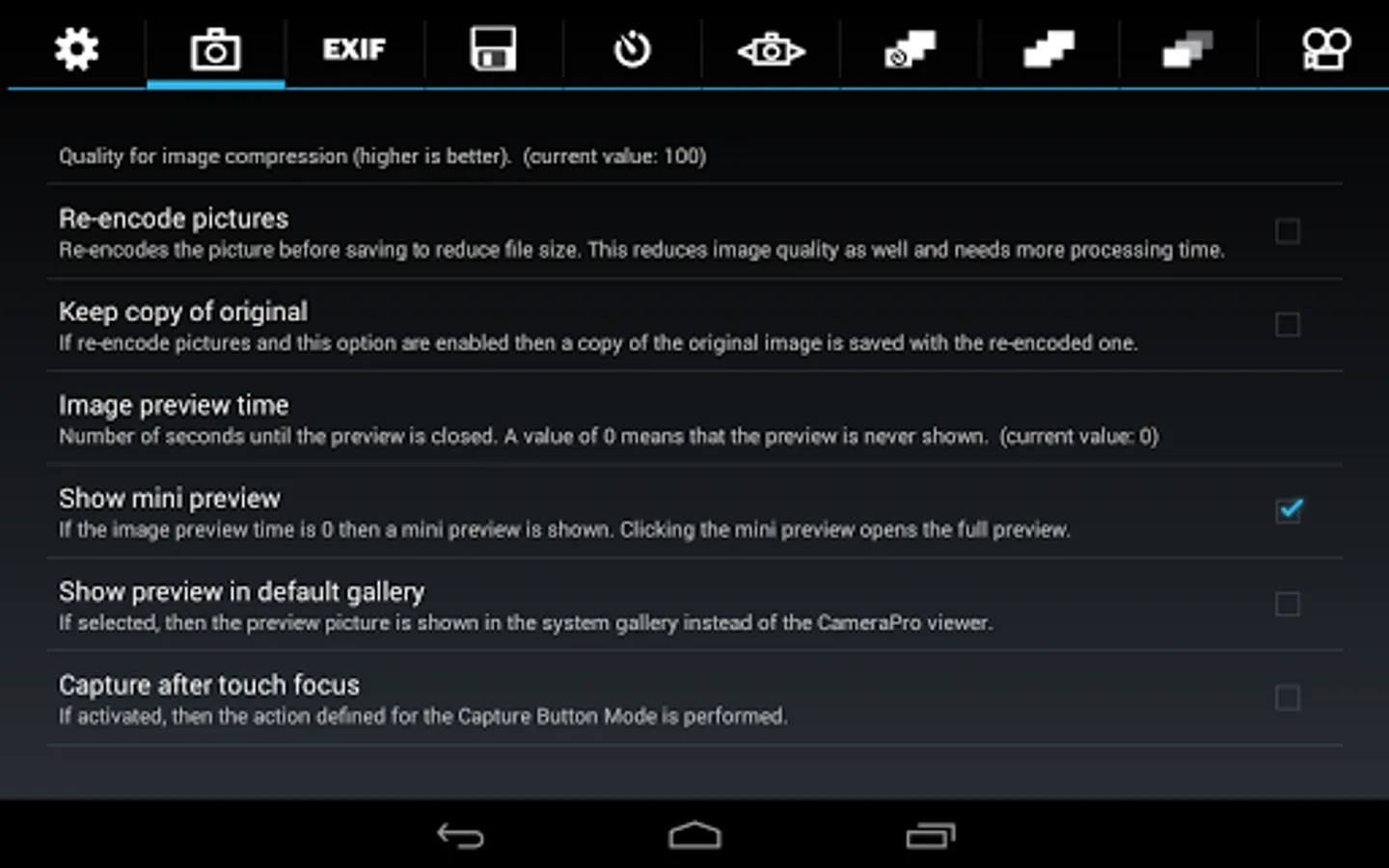 - Time-lapse: record time-lapse picture series (Android 3.0+: record time-lapse videos too)