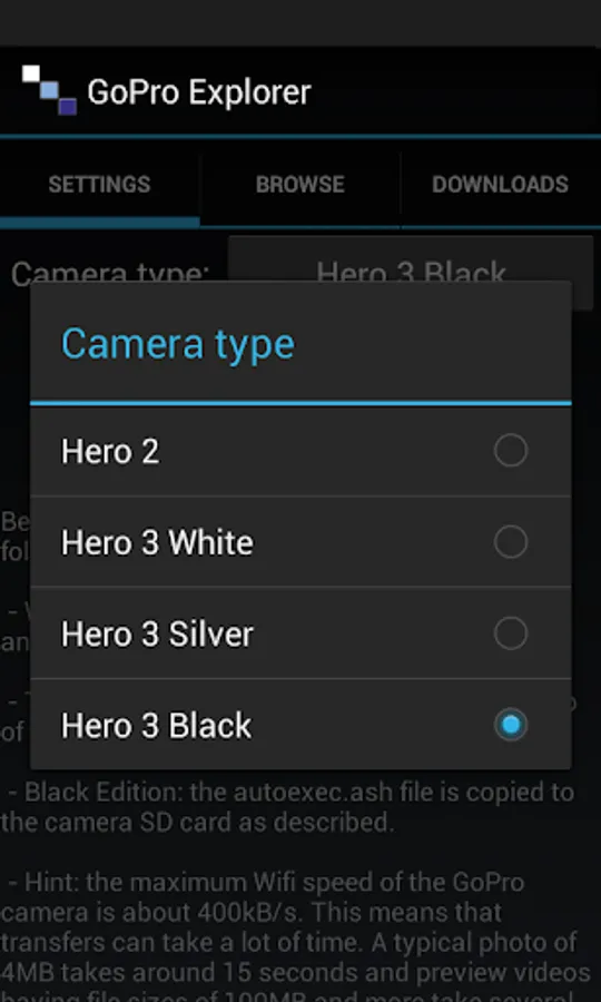 - The Wifi speed of the GoPro cameras is only around 100 to 400 kB/second which means that file downloads of full resolution photos and preview videos can take some time.