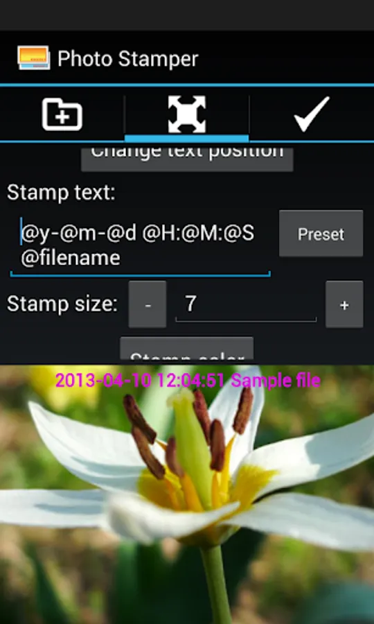 Use PhotoStamper to mark your photos with date, time, filename, and other text stamps.